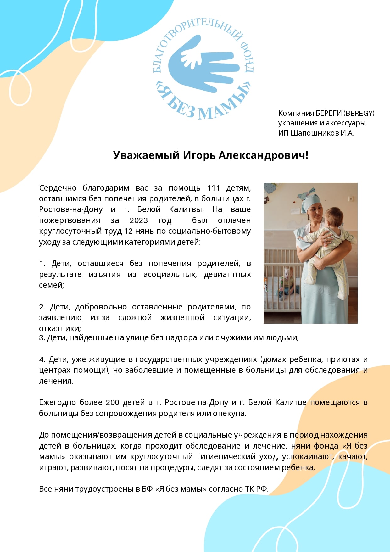 Ювелирный бренд БЕРЕГИ (BEREGY) начал свой путь в благотворительности с пожертвований в фонд «Я без мамы». За 2023 год мы смогли помочь более сотне детей, оставшихся без попечения родителей и находящихся в медицинских учреждениях г. Ростова-на-Дону и Ростовской области, это наполняет наши сердца светом и радостью. Наше стремление помогать только укрепляется, и мы продолжаем поддерживать благотворительные фонды.