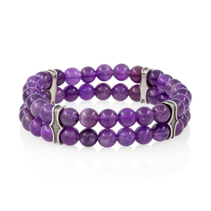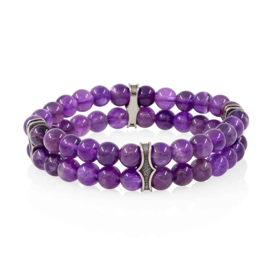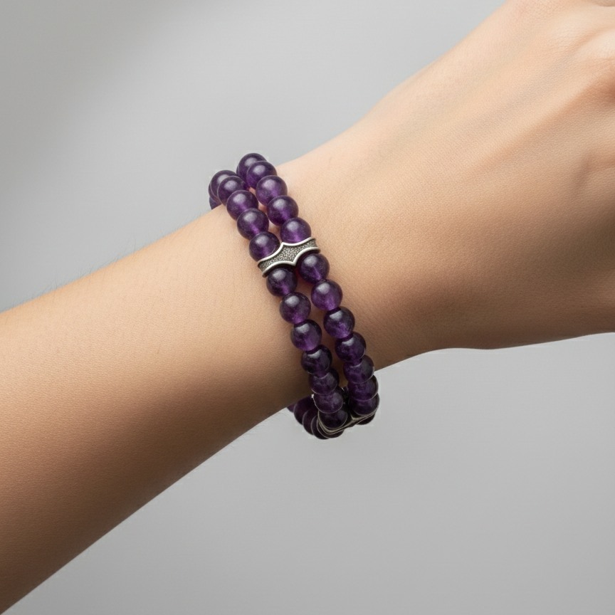 Двойной браслет из натурального аметиста с бусинами 6 мм — это стильный, выразительный аксессуар, сочетающий природную красоту камня и аккуратную ручную работу. Прочный мельхиоровый шарм соединяет ряды, фиксирует форму и служит изящным декоративным акцентом.