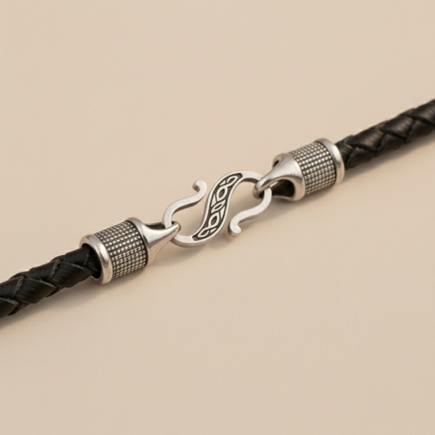 Плетёный шнур выполнен из натуральной кожи. Диаметр гайтана составляет 5 мм.