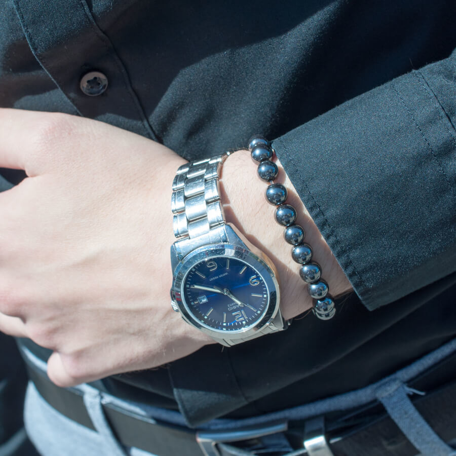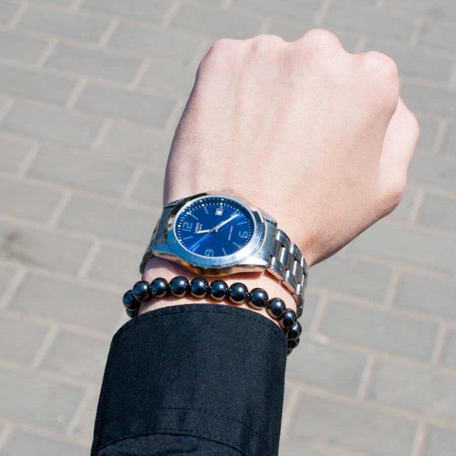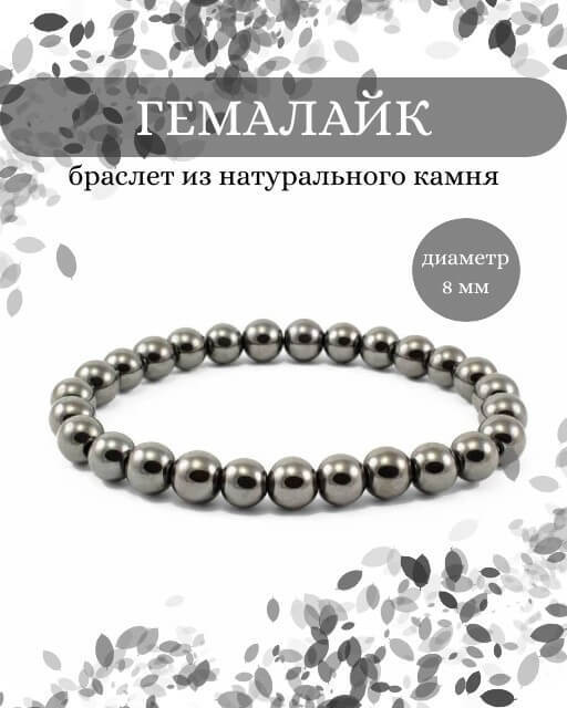 Браслет изготовлен в виде классического украшения на запястье, в этой модели браслета коллекции Classic мы не используем шармов и спейсеров. В основе браслета натуральный камень гемалайк стального цвета, диаметр бусины 8 мм, блеск камня естественный после сухой полировки методом галтования. Бусины гемалайка скреплены между собой высокопрочной эластичной нитью диаметром 1 миллиметр.