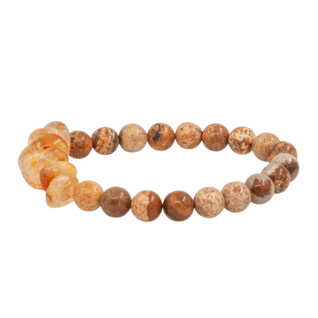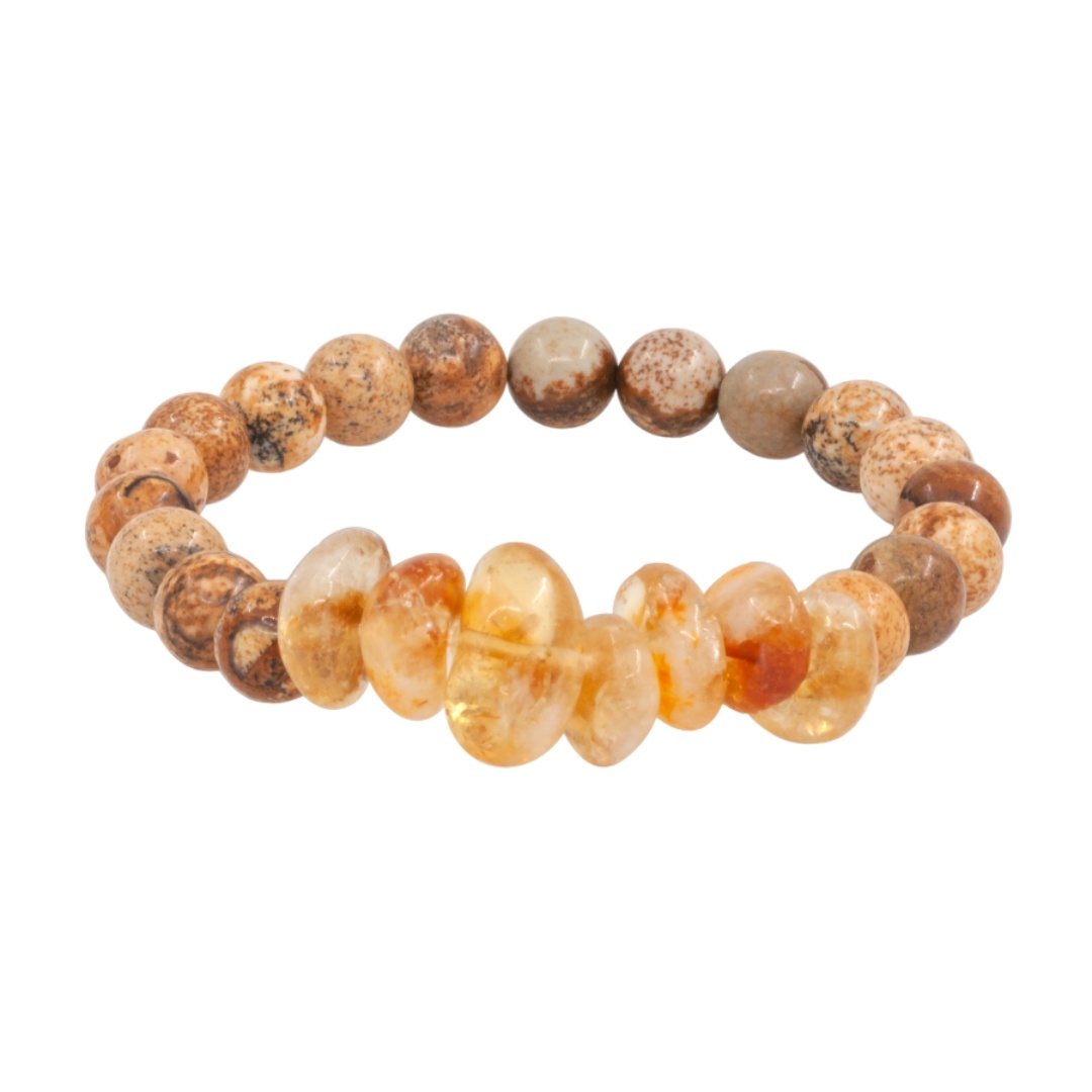 Браслет из цитрина и яшмы пейзажной ценится не только за тёплое природное сочетание оттенков, но и за свои символические свойства. Цитрин считается камнем солнечной энергии и изобилия: ему приписывают способность притягивать удачу, усиливать уверенность в себе и вдохновлять на новые достижения. Он ассоциируется с радостью, ясностью мыслей и внутренним светом.