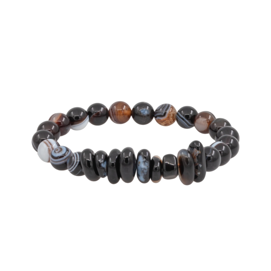 Этот браслет представляет собой изысканное сочетание двух выразительных разновидностей одного минерала, создавая глубокий и многогранный образ. Благородная палитра природных оттенков агата в сочетании с его уникальной текстурой превращает украшение в стильный аксессуар, наполненный древней символикой и природной силой земли.