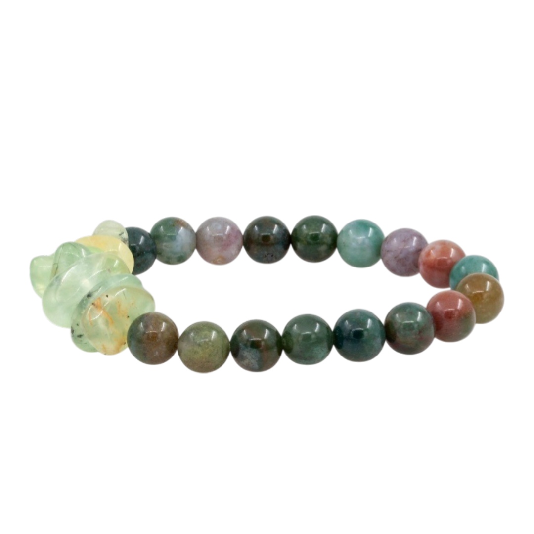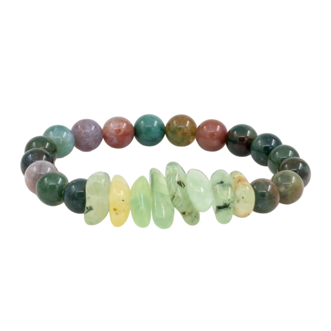 Браслет из пренита и зелёной яшмы ценится не только за природную красоту, но и за свои символические свойства. Пренит считается камнем внутренней гармонии и душевного спокойствия: ему приписывают способность снижать тревожность, усиливать интуицию и помогать принимать взвешенные решения. Он ассоциируется с обновлением, мягкой энергией и эмоциональным исцелением.