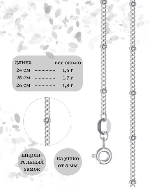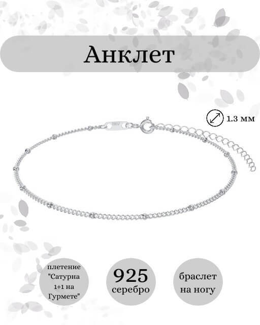 Мы представляем серебряный анклет - браслет на ногу с плетением Сатурна на Гурмете из серебра 925 пробы с покрытием родием. Цепочка идеально подойдет как самостоятельное украшение, при желании можно носить изделие с подвесками (подойдет на ушко от 5 мм). Ширина цепочки около 1.3 мм. Вес браслета в зависимости от длины: 24 см - 1,6 г, 25 см - 1,7 г, 26 см - 1,8 г.