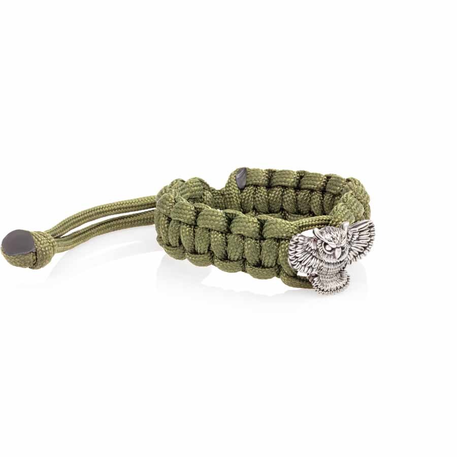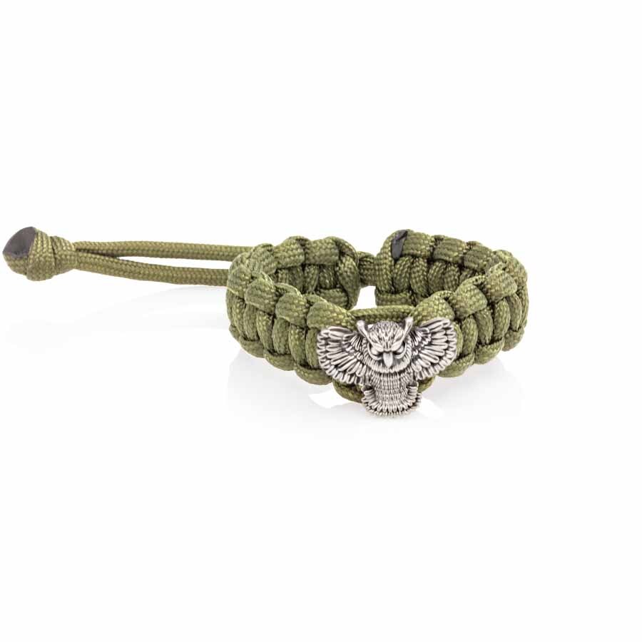 Браслет с шармом Сова из мельхиора - зеленый паракорд