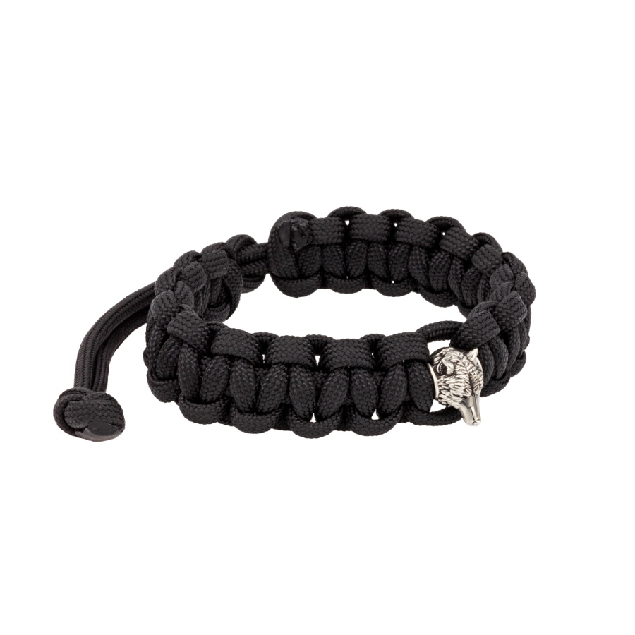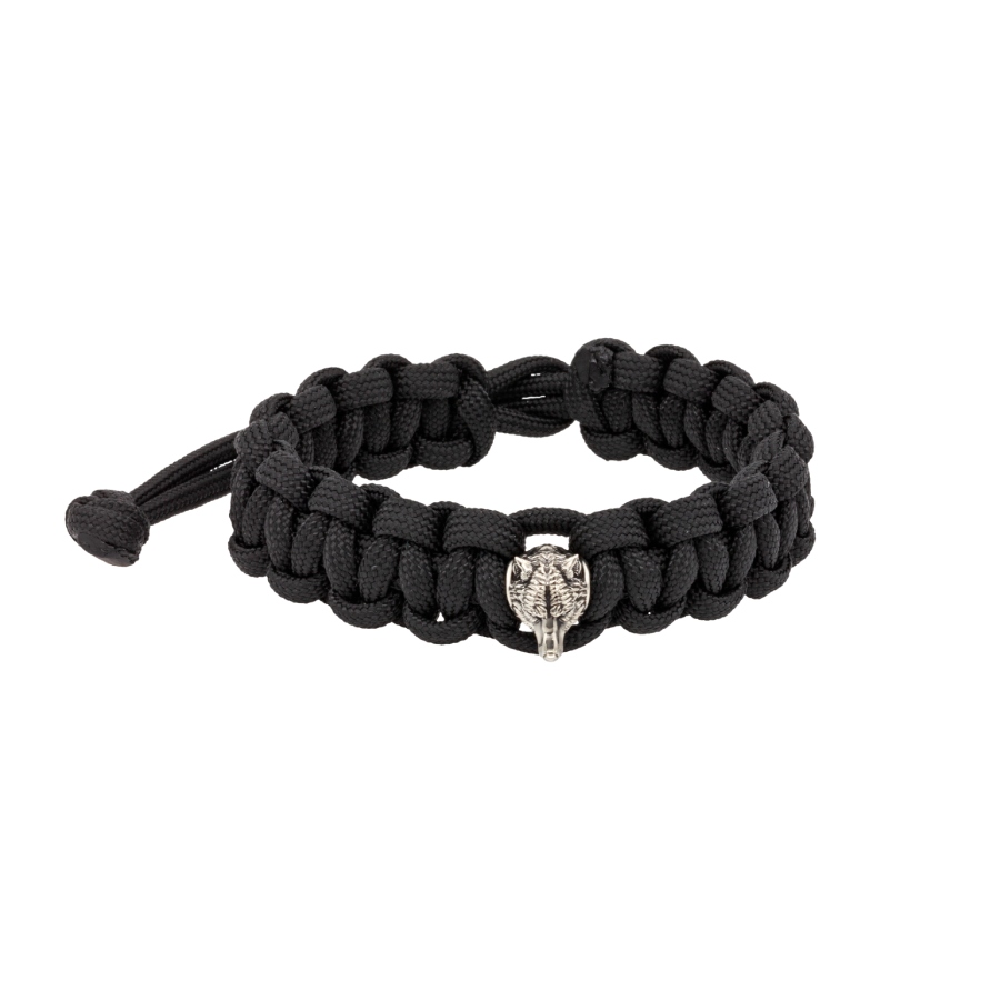 Браслет с шармом Волк из мельхиора - чёрный паракорд