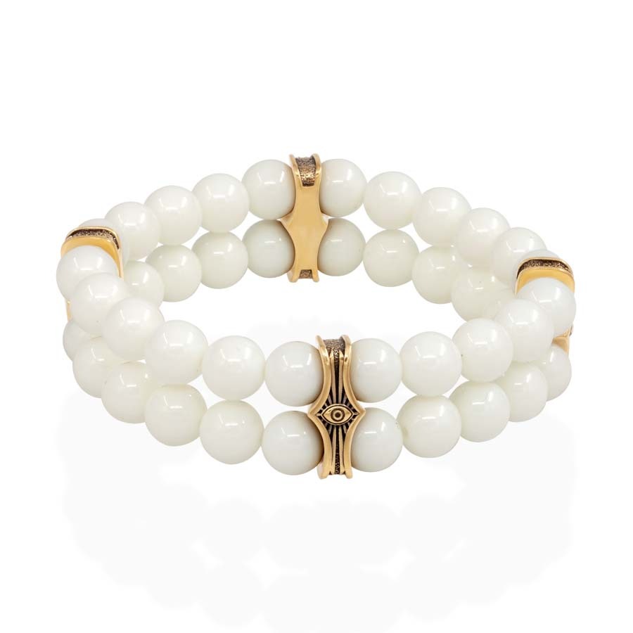 Двойной браслет с шармом Всевидящее око выполнен из бронзы и дополнен белыми керамическими бусинами диаметром 8 мм.