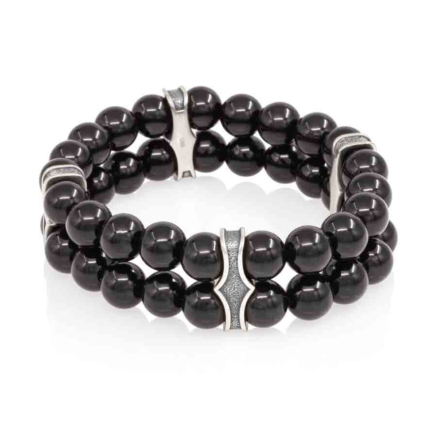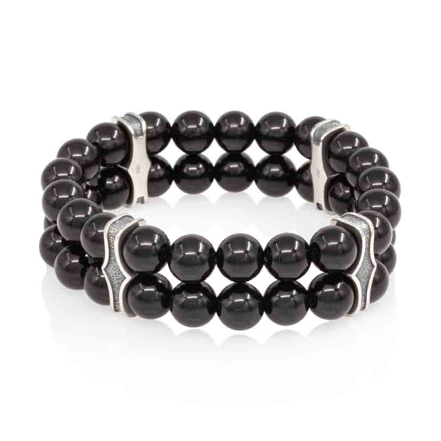 Двойной браслет из черного кварца 8 мм с шармами из серебра