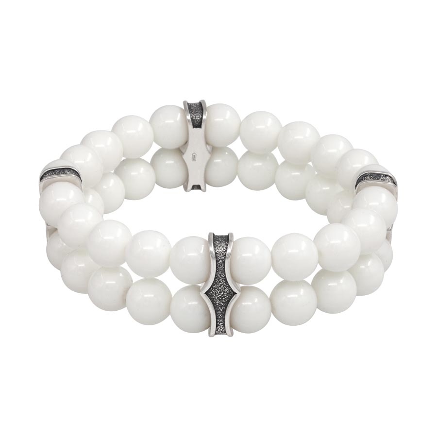 Керамика ценится за прочность, устойчивость к внешним воздействиям и приятную тактильную поверхность. Материал не теряет цвет и сохраняет аккуратный внешний вид при регулярной носке. Декоративные шармы из мельхиора добавляют выразительный акцент и подчёркивают индивидуальность дизайна. Двойная конструкция делает браслет визуально насыщенным, оставаясь при этом лёгким и комфортным на руке.