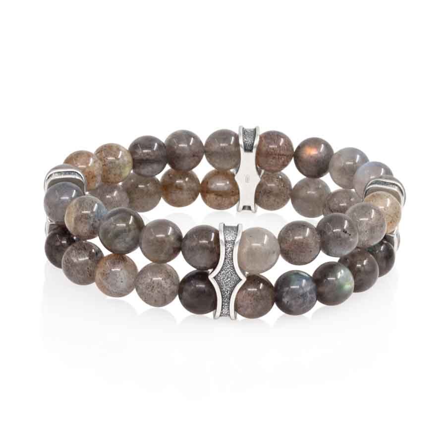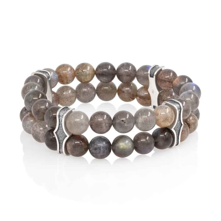 Двойной браслет с шармами из серебра 925 пробы и лабрадора 8 мм символизирует духовное развитие и эмоциональное равновесие.