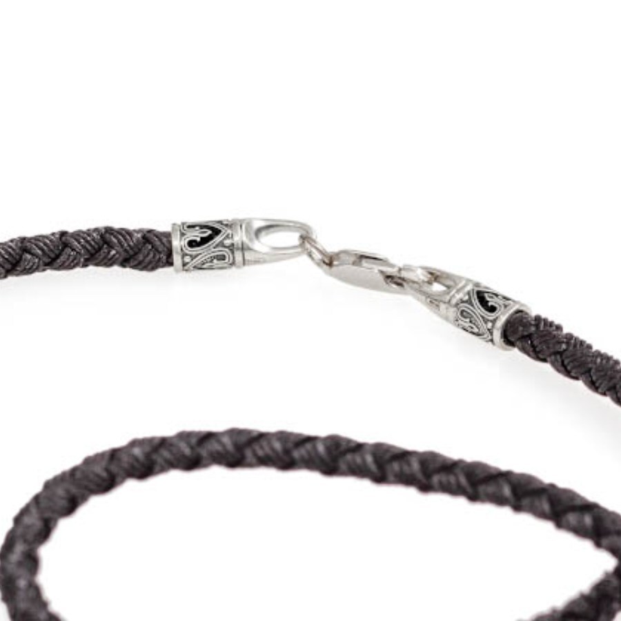 Основа гайтана состоит из тканевого шнура ручной работы. Толщина шнура около 2,5 мм. В гайтане используется фурнитура состоящая из трех деталей отлитых из серебра 925 пробы, тип фурнитуры - крючок. Фурнитура очень крепкая, изготовлена методом литья по выплавляемым моделям. С уверенностью скажем, что сломать замок случайно невозможно, в отличии от замков китайского производства. Серебряная фурнитура надежно закреплена с помощью клея. При подборе необходимо обязательно опираться на диаметр ушка подвески, которую вы хотите сочетать.