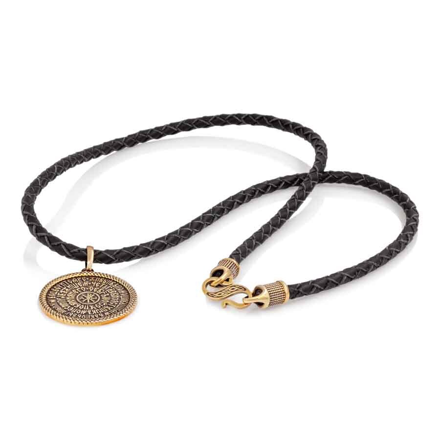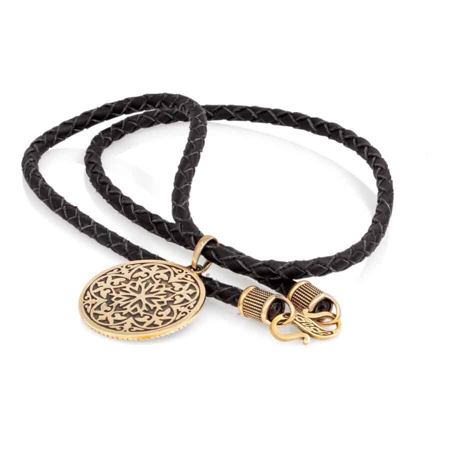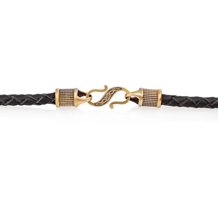 основа гайтана состоит из кожаного плетеного шнура ручной работы. Диаметр кожаного гайтана составляет 5 мм. В гайтане используется фурнитура состоящая из трех деталей отлитых из бронзы, тип фурнитуры - крючок. Фурнитура очень крепкая, изготовлена методом литья по выплавляемым моделям. С уверенностью скажем, что сломать замок случайно невозможно, в отличии от замков китайского производства. Бронзовая фурнитура надежно закреплена с помощью клея.