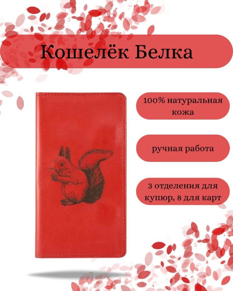 Выполнено из натуральной бычьей кожи с лазерной гравировкой принта Белочка на лицевой стороне и логотипа бренда производителя внутри кошелька.