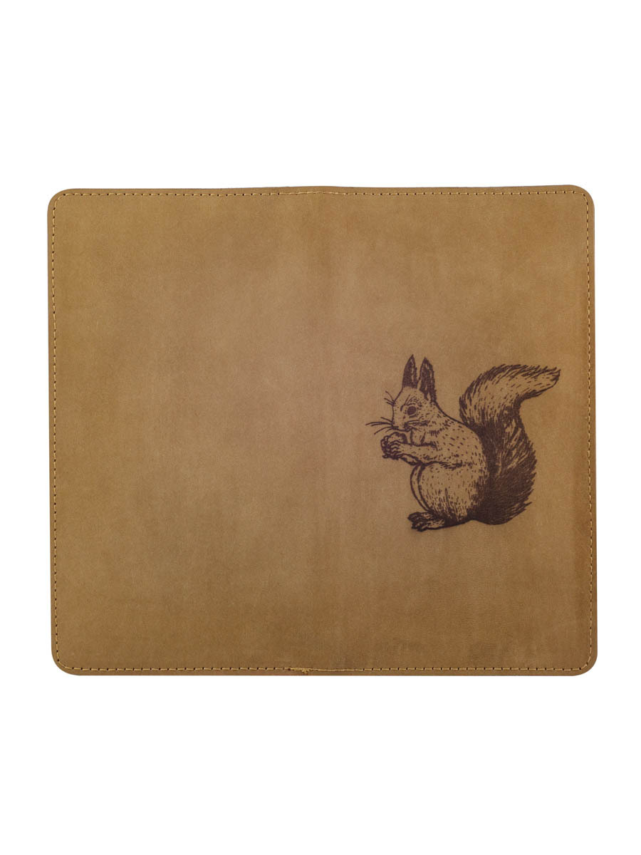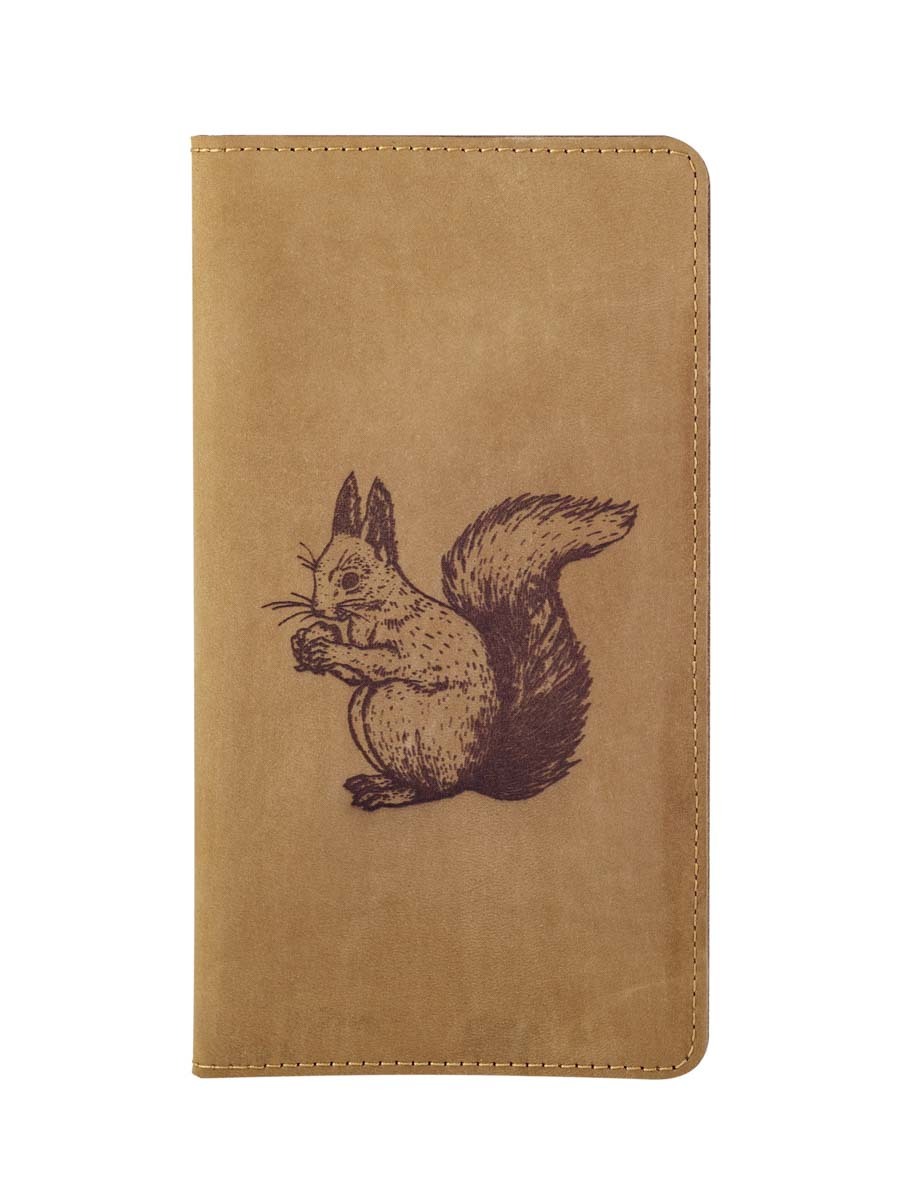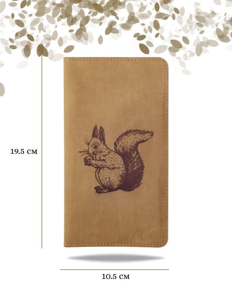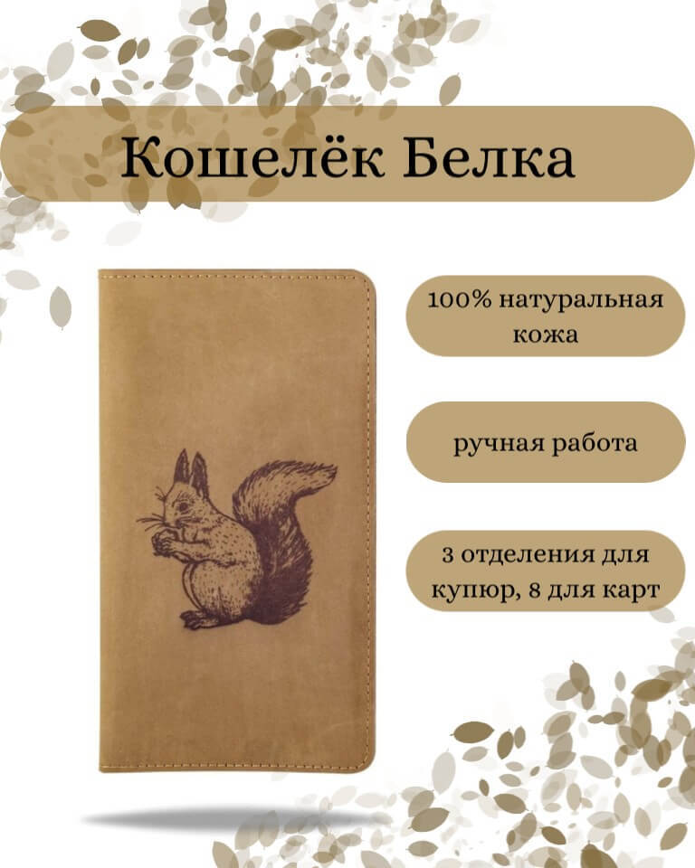 Выполнено из натуральной бычьей кожи с лазерной гравировкой принта Белочка на лицевой стороне и логотипа бренда производителя внутри кошелька.