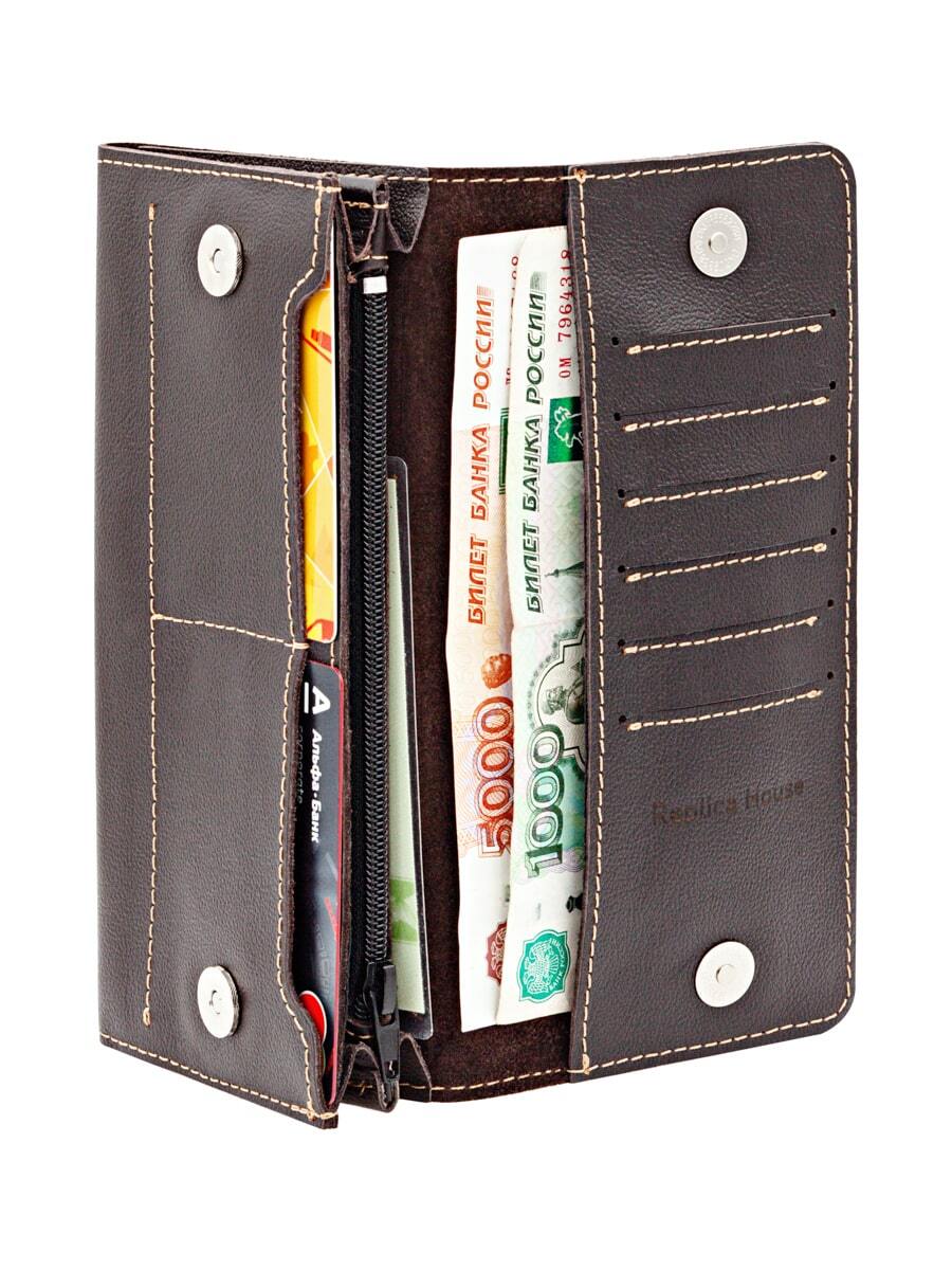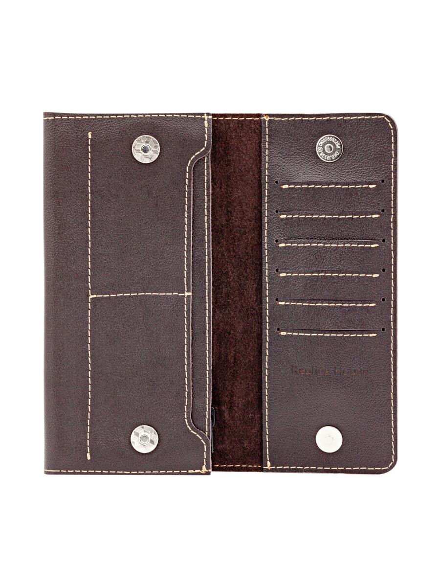 Дополняет стиль кошелька видимая часть кожи, которая не прошла обработку и крепкий шов по периметру изделия. Логотип производителя во внутренней части кошелька нанесен лазерной гравировкой.