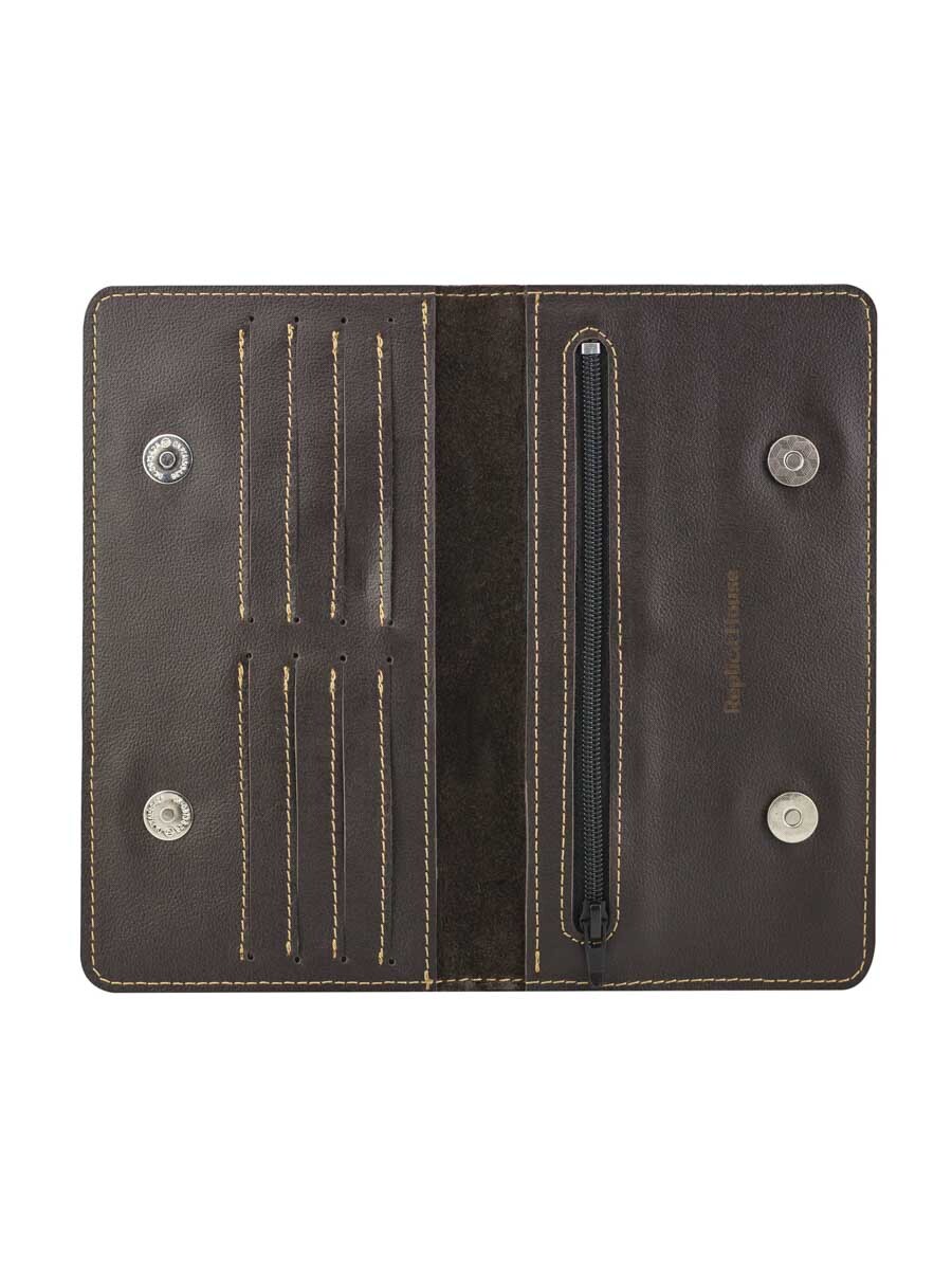 Дополняет стиль кошелька видимая часть кожи, которая не прошла обработку и крепкий шов по периметру изделия. Логотип производителя во внутренней части кошелька нанесен лазерной гравировкой.