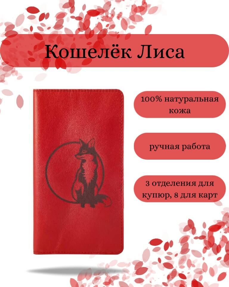 Выполнено из натуральной бычьей кожи с лазерной гравировкой принта Лиса на лицевой стороне и логотипа бренда производителя внутри кошелька.
