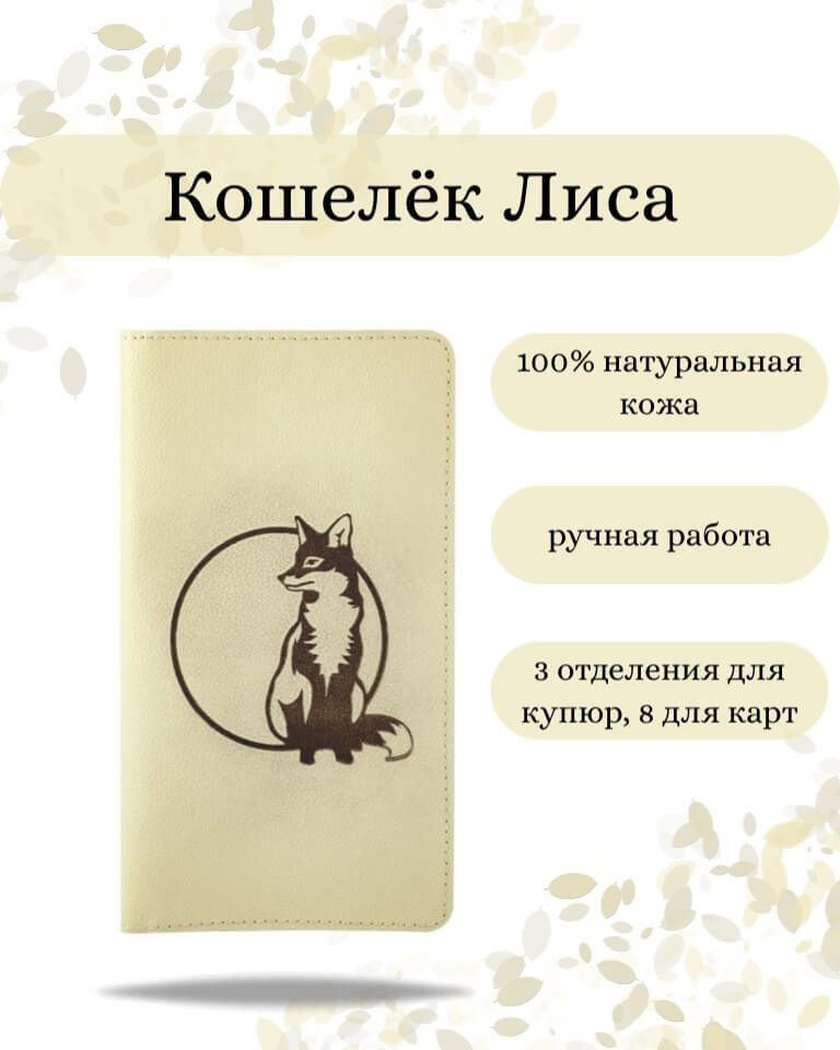 Выполнено из натуральной бычьей кожи с лазерной гравировкой принта Лиса на лицевой стороне и логотипа бренда производителя внутри кошелька.