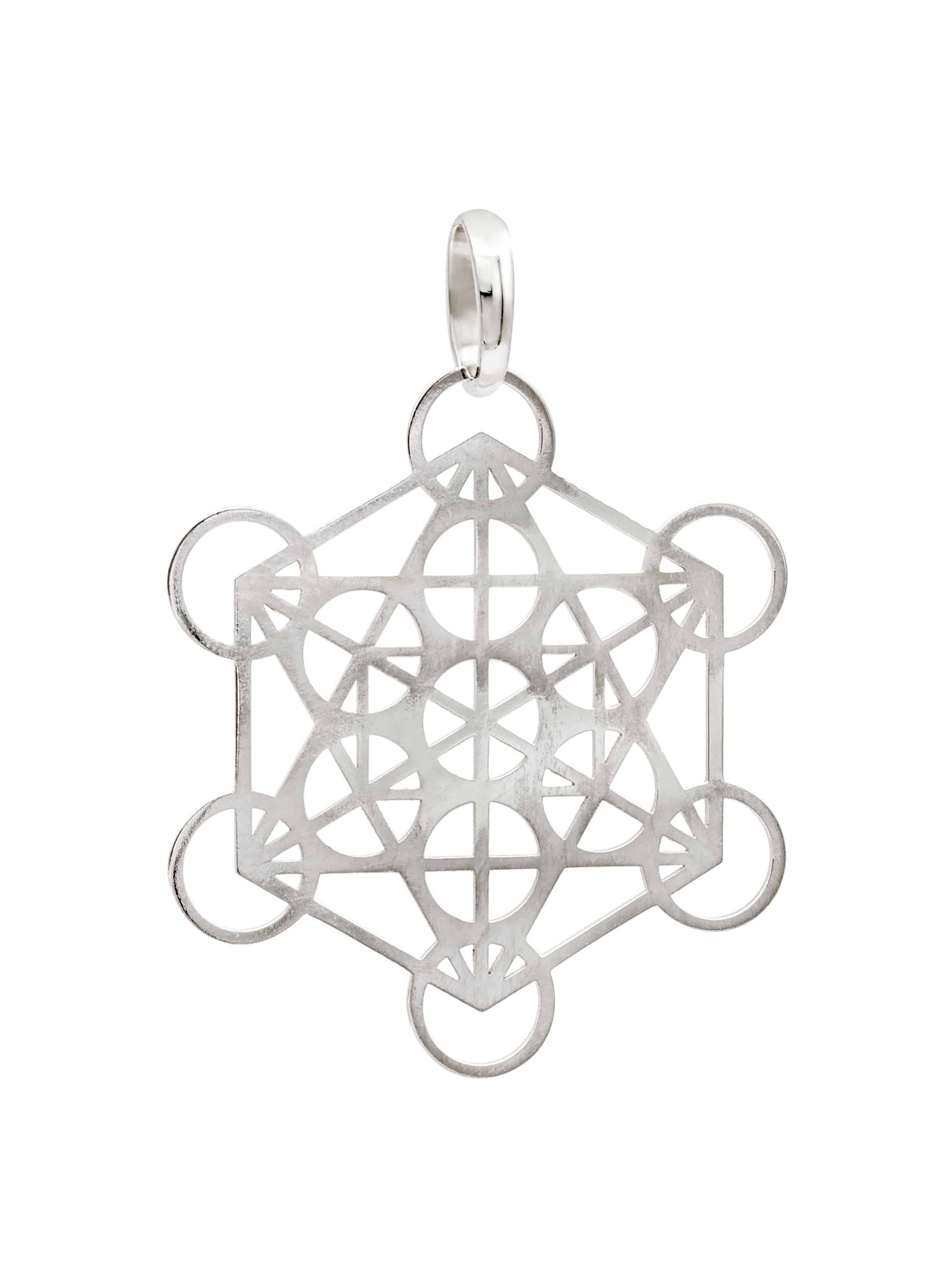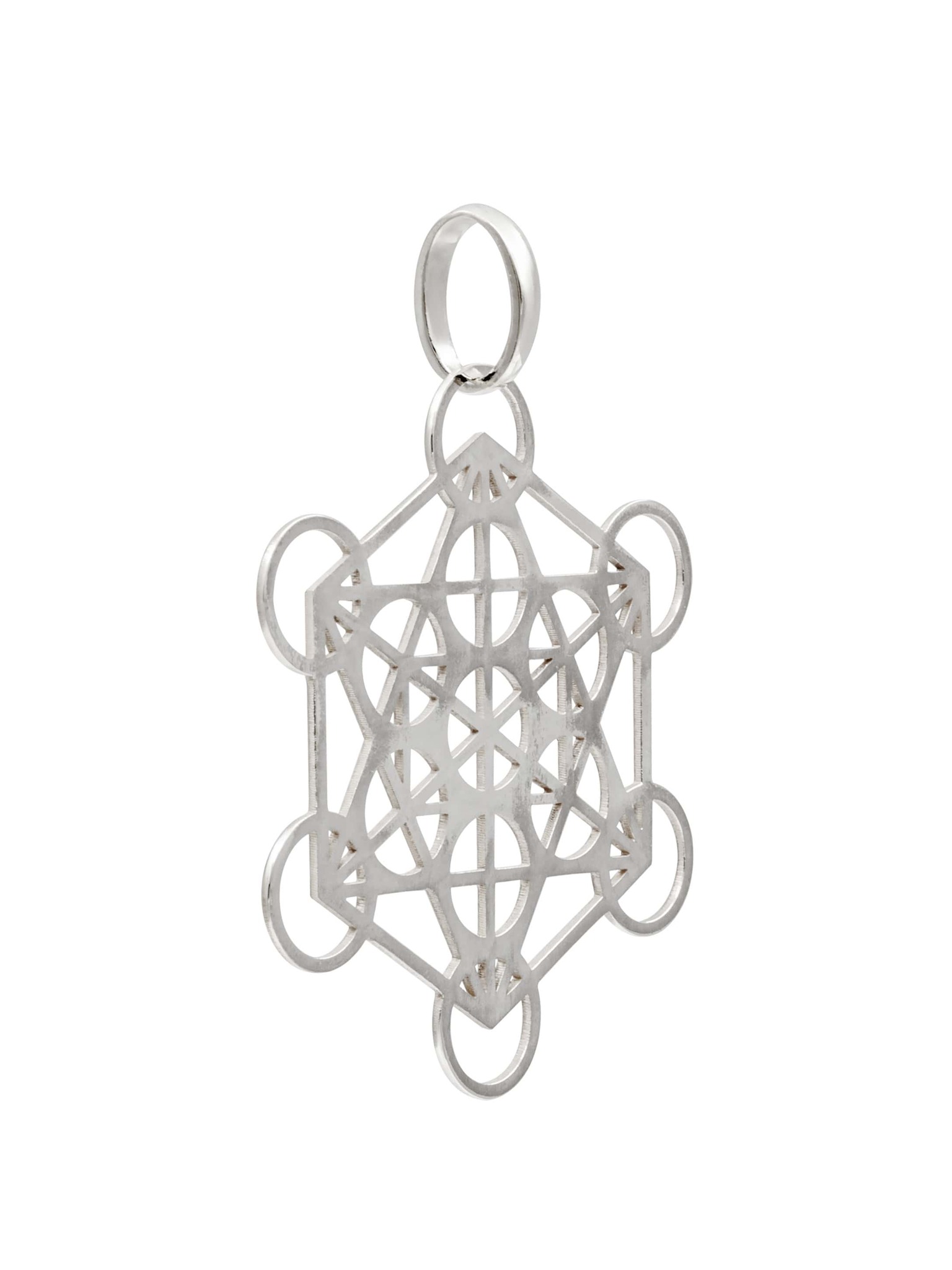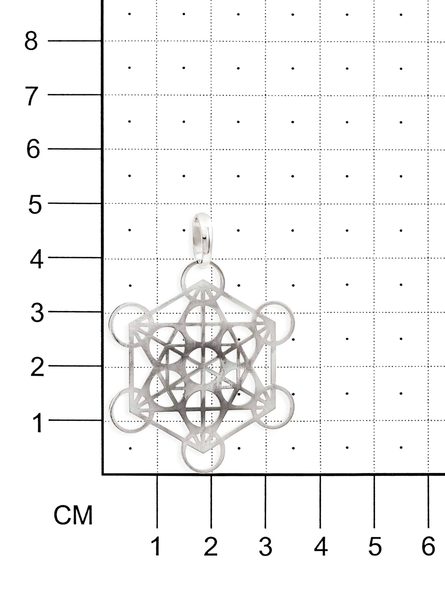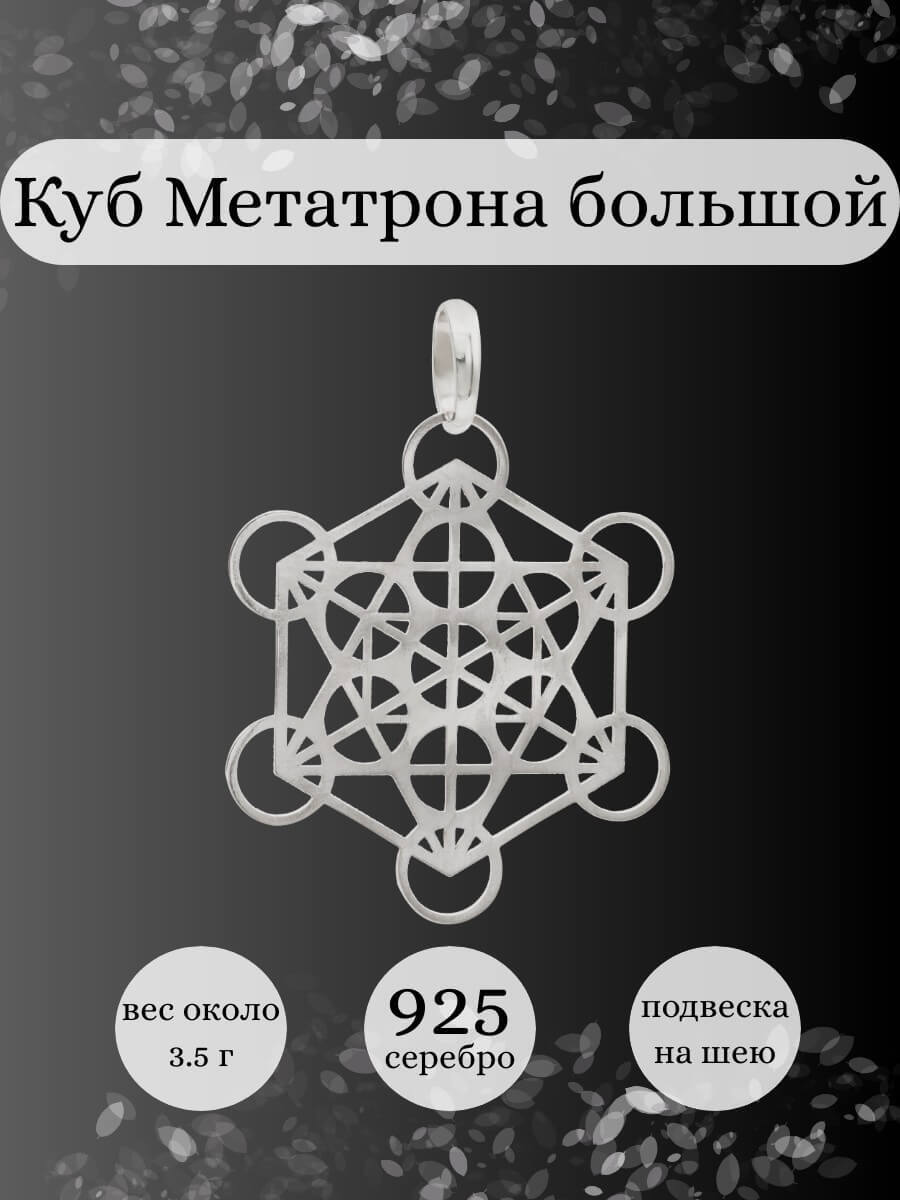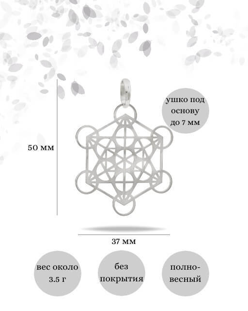Ювелирная подвеска на шею с изображением Куба Метатрона изготовлена из серебра 925 пробы и отполирована до зеркального блеска. Вес изделия около 3,5 г, размер 50х37 мм, ушко на основу до 7 мм.