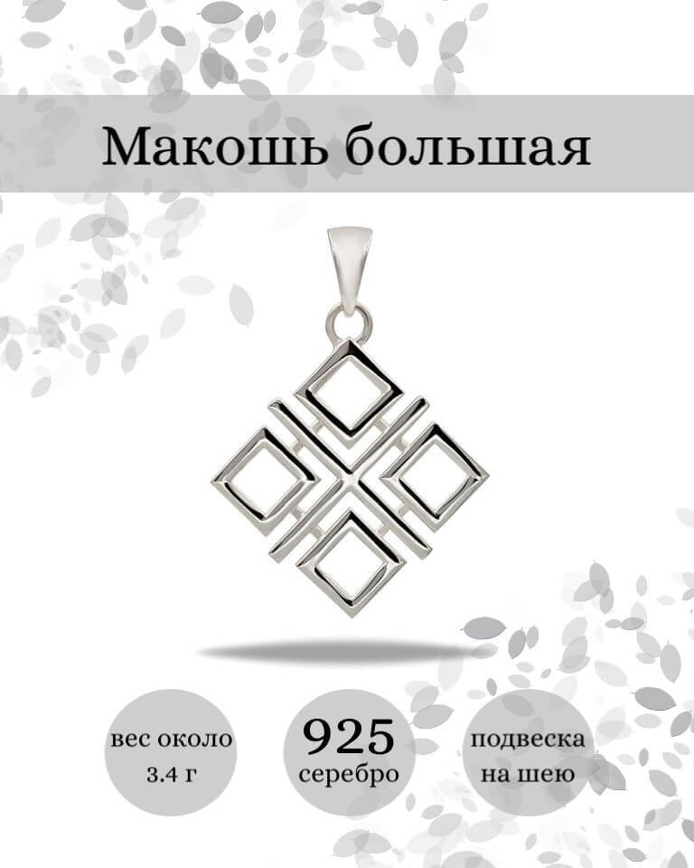 Подвеска Макошь смотрится на удивление реалистично и живо, хоть отлито из серебра. Эффект достигается с одной стороны качеством обработки, а с другой – особенной воздушной формой. Все это создает волшебный образ, серебряная подвеска обретает живость и реалистичность.