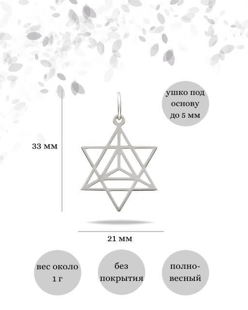 Ювелирная подвеска с изображением символа сакральной геометрии Меркаба (Звездный тетраэдр) изготовлена из серебра 925 пробы. Вес кулона около 1 г, размер 33х21 мм, ушко на основу до 5 мм.