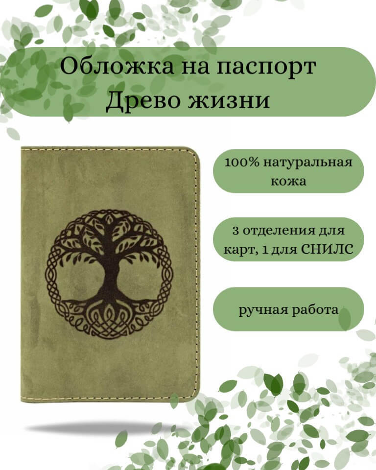 Обложка изготовлена на собственном производстве Beregy в городе Ростов-на-Дону, поэтому мы контролируем качество каждой изготовленной нами продукции. Произведена из натуральной бычьей кожи с гравировкой в виде стилизованного Древа жизни.
