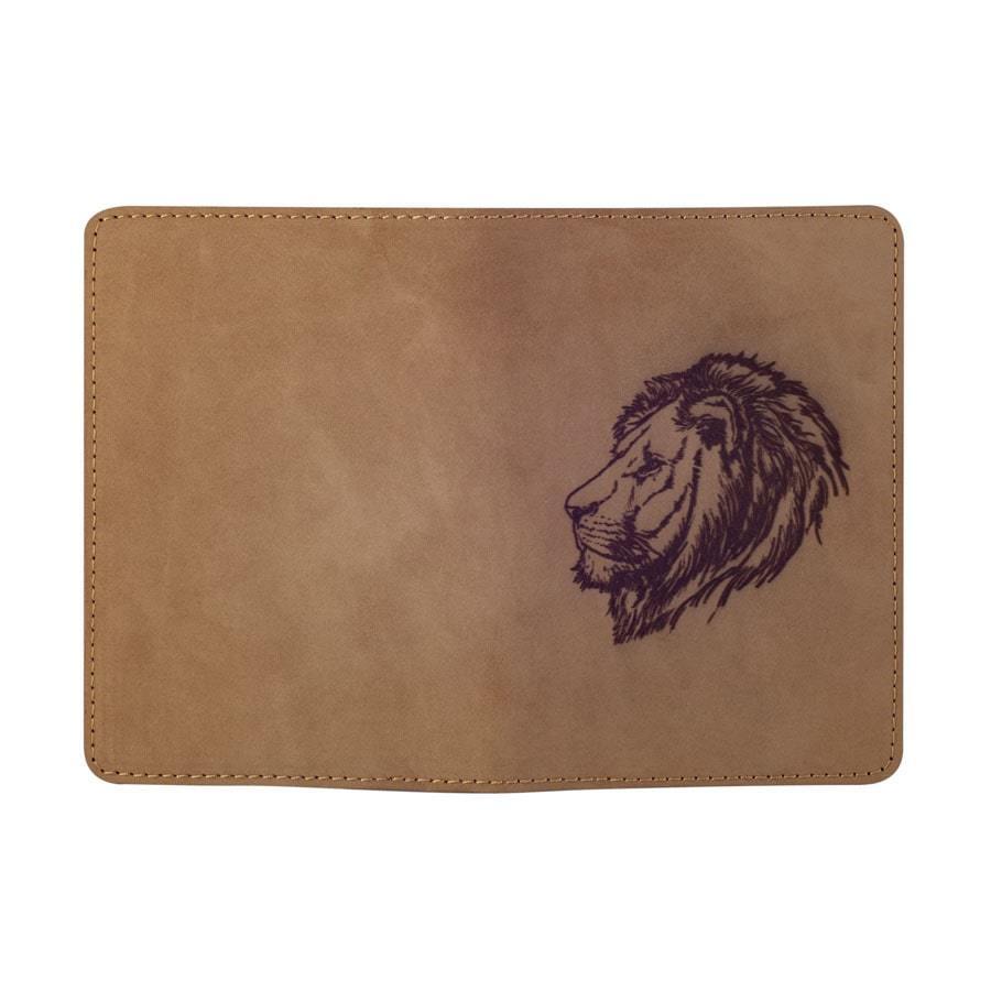На фасадной части обложки методом лазерной гравировки нанесено изображение в виде головы льва.