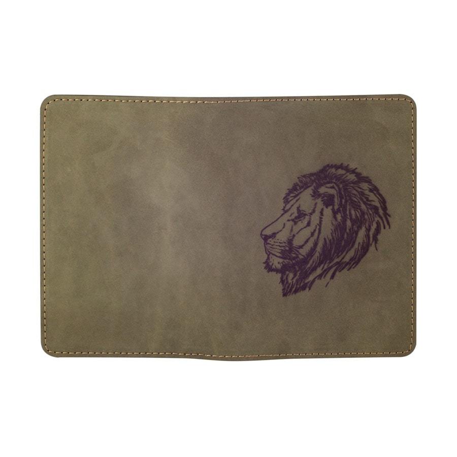 На фасадной части обложки методом лазерной гравировки нанесено изображение в виде головы льва.