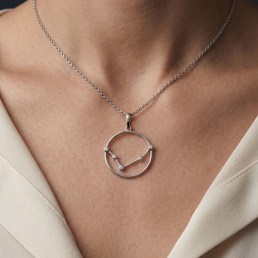Овен символизирует неукротимую жизненную энергию. Яркие фианиты, украшающие контур созвездия, ярко переливаются на свету, подчеркивая огненный темперамент, уверенность в себе и решительность прирожденного лидера.