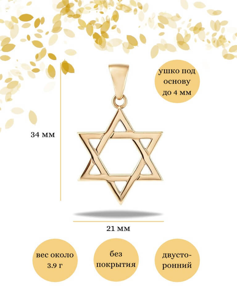 Подвеска, представленная на нашем сайте, покажет море возможностей для развития, продвижения по карьерной лестнице и станет мощным оберегом от врагов и лукавых людей, которые скрывают истинное обличье. Купив золотую Звезду Давида, еврею нужно принести кулон в храм для благословения, вот тогда медальон проявит свою силу сполна.