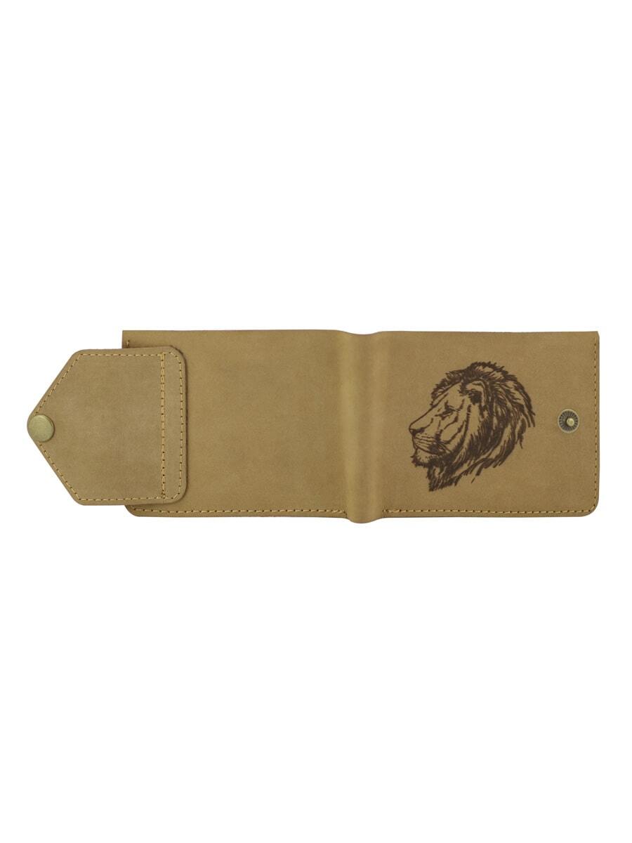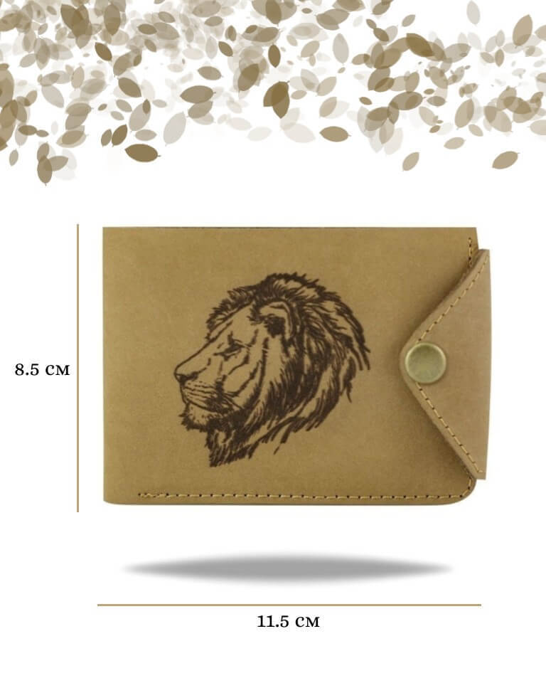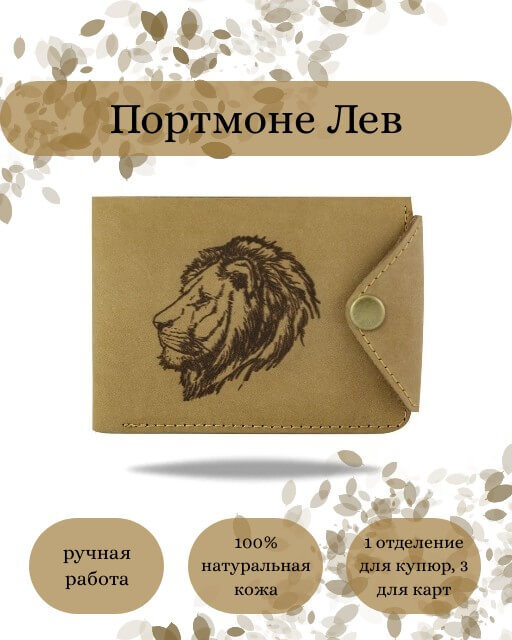 Выполнено из натуральной бычьей кожи с гравировкой в виде стилизованного изображения головы льва.