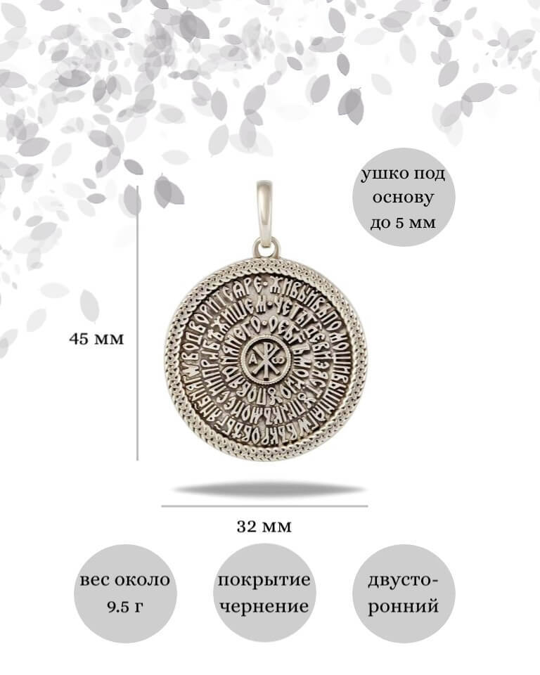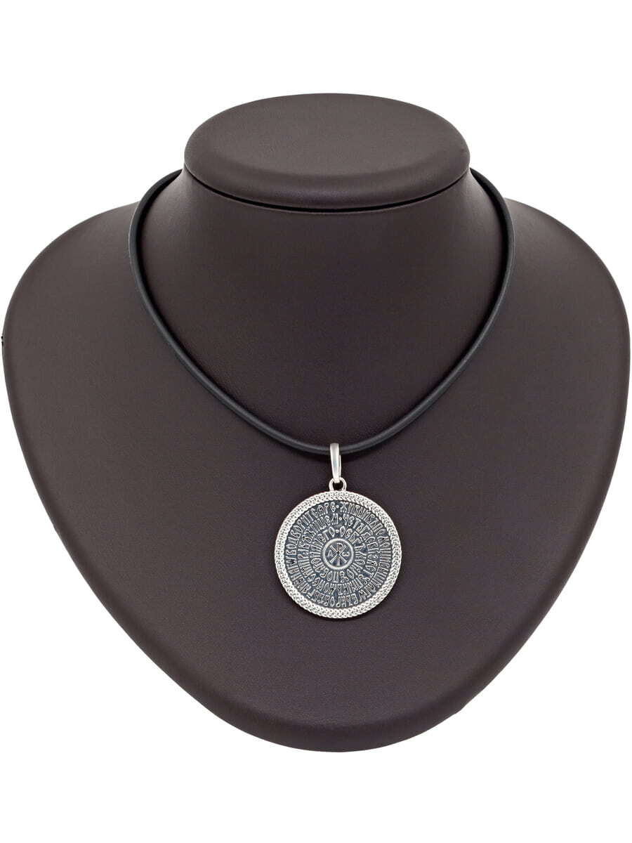 Вещь, которая очаровывает тем больше, чем больше Вы на неё смотрите, чем больше узнаете о ней, проникаете в стих псалма. Диск в виде подвески с первыми строками девяностого псалма выполнен из серебра 925 пробы и покрыт благородной патиной. Он выглядит так, будто был создан столетия назад и достался Вам от мудрого старца-странника. Мы рекомендуем вам купить подвеску 90 Псалом Песнь Давида, ведь в этом украшении соединились: простота формы, тонкость выделки и глубина святых слов.