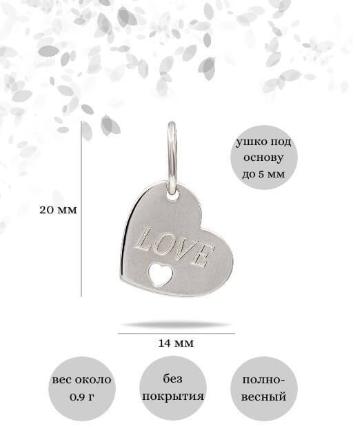 Подвеска изготовлена из серебра 925 пробы. Размер 20х14, ушко подойдет на основу до 5 мм. Вес около 0,9 г.