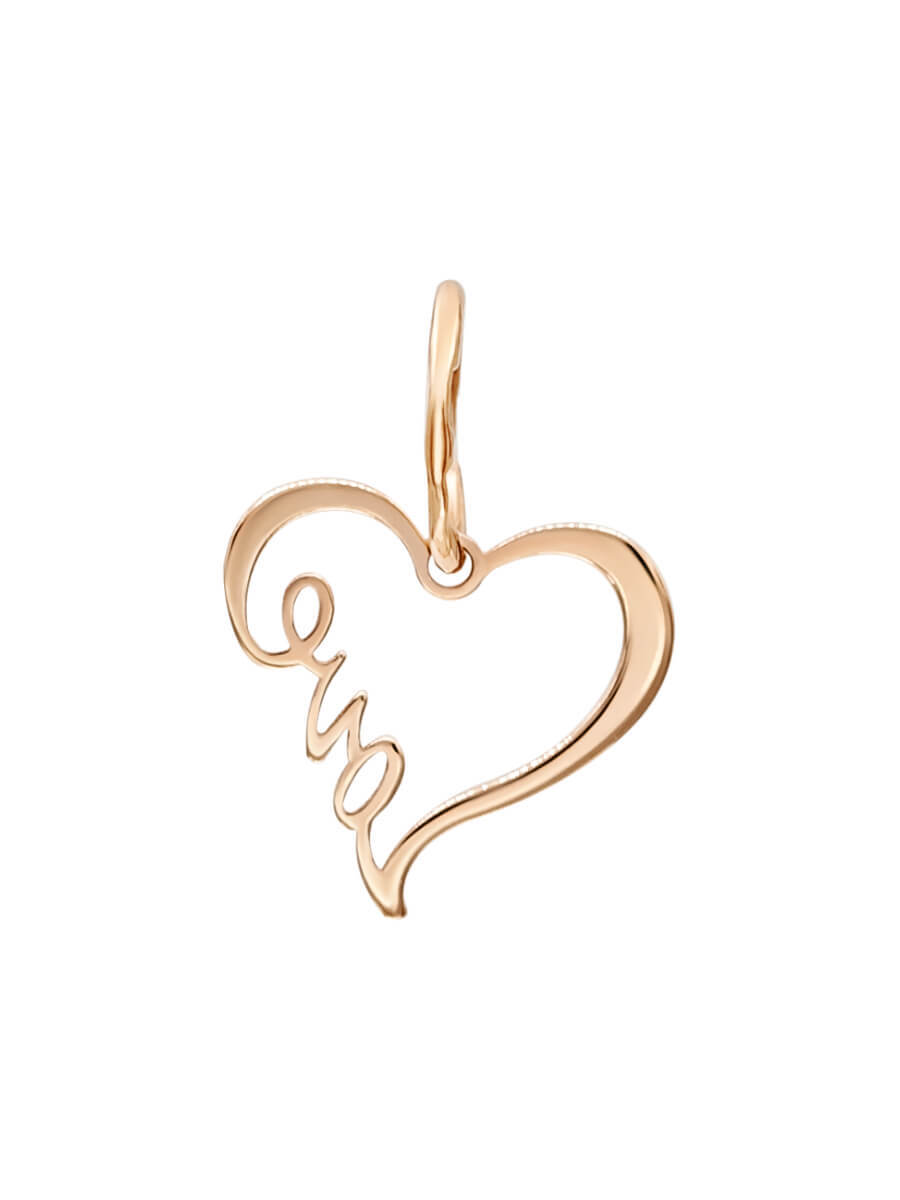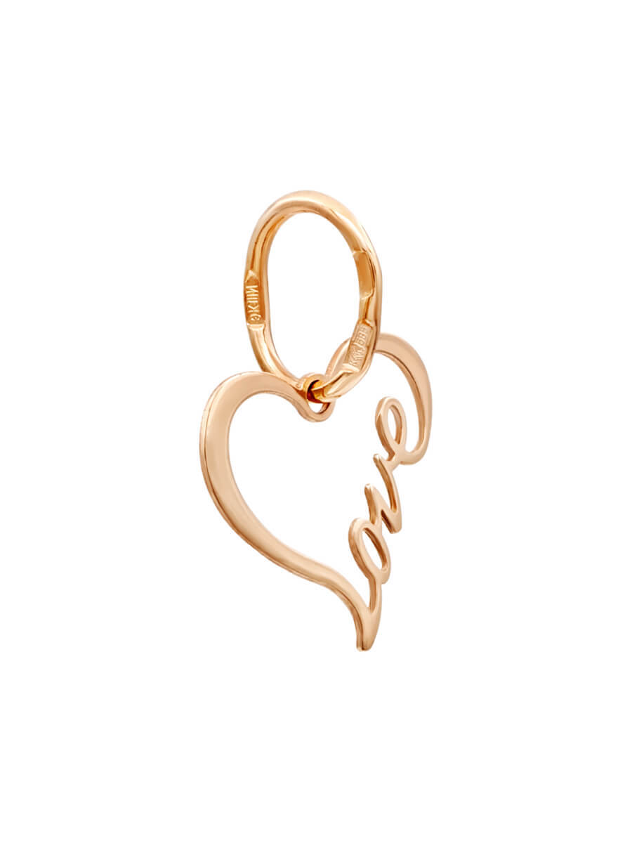 Ювелирная золотая подвеска на шею Сердце Love изготовлена из красного золота 585 пробы. Размер изделия 19х13 мм, ушко под основу до 5 мм, вес около 0,3 г.