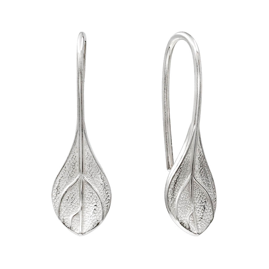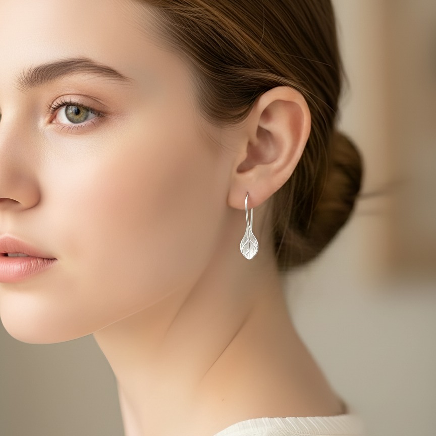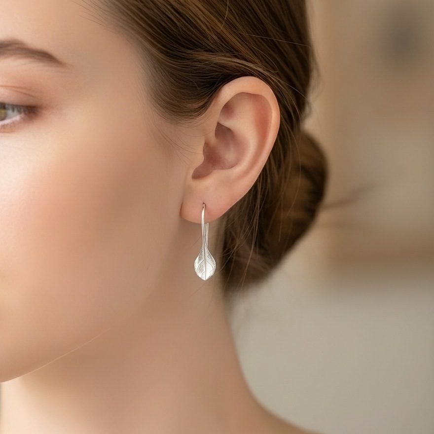 Серьги в форме листика имеют тонкую вытянутую форму с деликатной фактурой прожилок, благодаря чему украшение выглядит живым и натуральным. Матовая и слегка сатинированная поверхность красиво рассеивает свет, придавая серьгам благородный и утончённый вид.