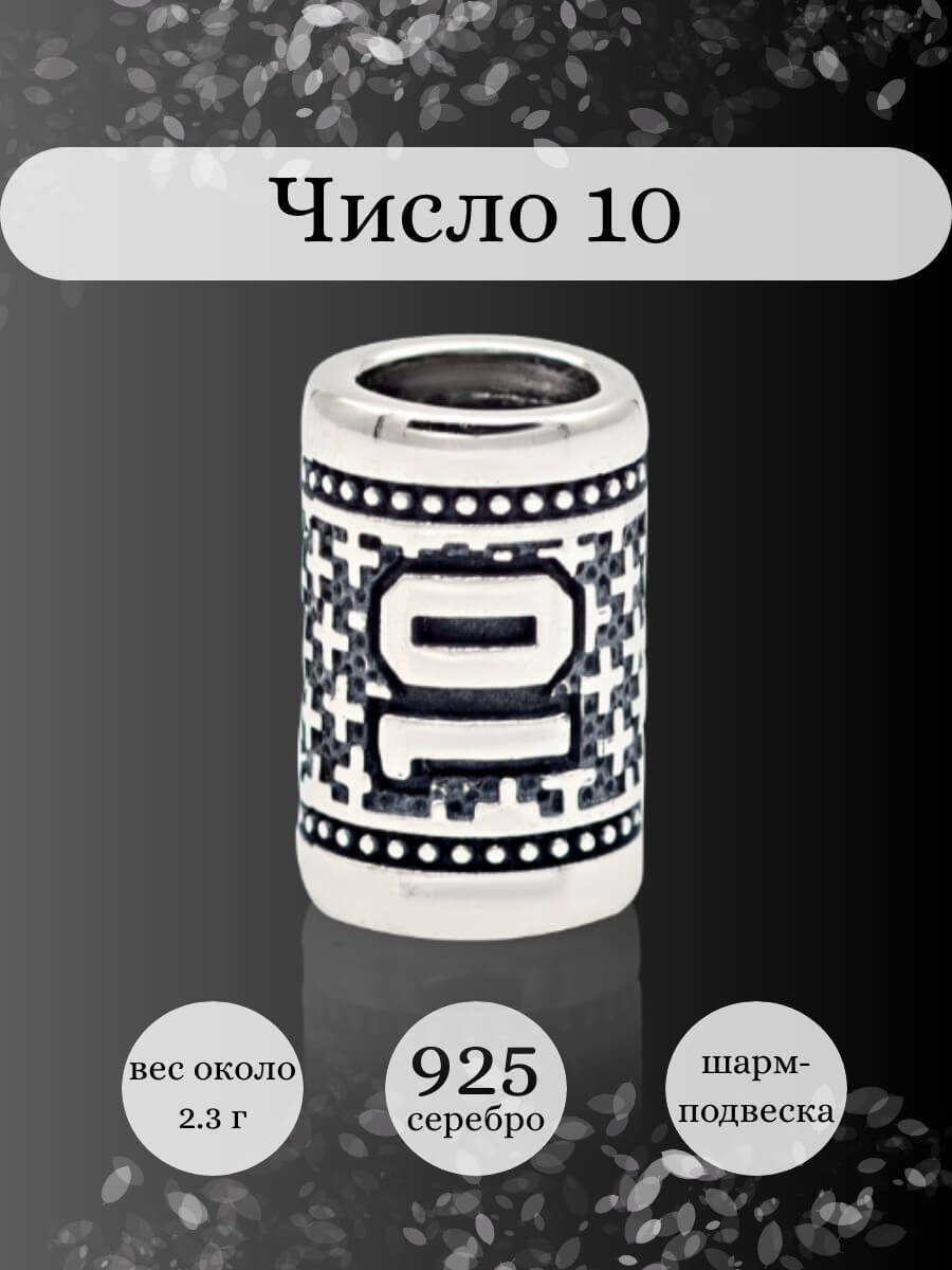 Число 10 символизирует гармонию, совершенство и баланс. Поэтому шарм из серебра с символикой числа 10 может стать символом здоровья, процветания и гармонии в семейных отношениях.