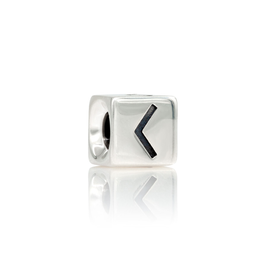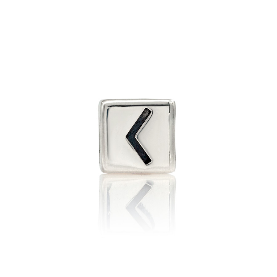 Шарм выполнен из серебра 925 пробы с руной Кеназ, символизировавшей у древних скандинавов свет и факел. Открытая форма на грани куба выглядит динамично, а блеск серебра подчёркивает графичность линии. Кубическая форма подчёркивает строгую геометрию символа.