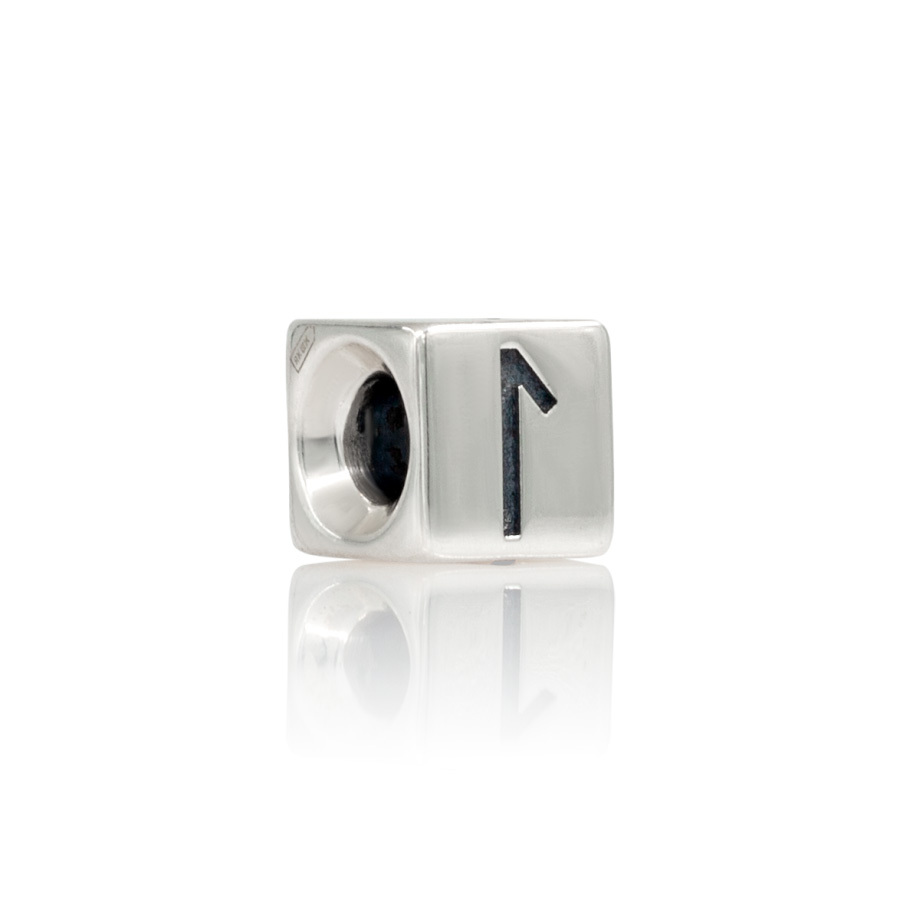 Шарм изготовлен из серебра 925 пробы с руной Лагуз, ассоциировавшейся у северных народов с водой и потоками. Изогнутая линия на грани куба создаёт плавный контраст с ровными гранями, а блеск серебра подчёркивает изгибы символа.