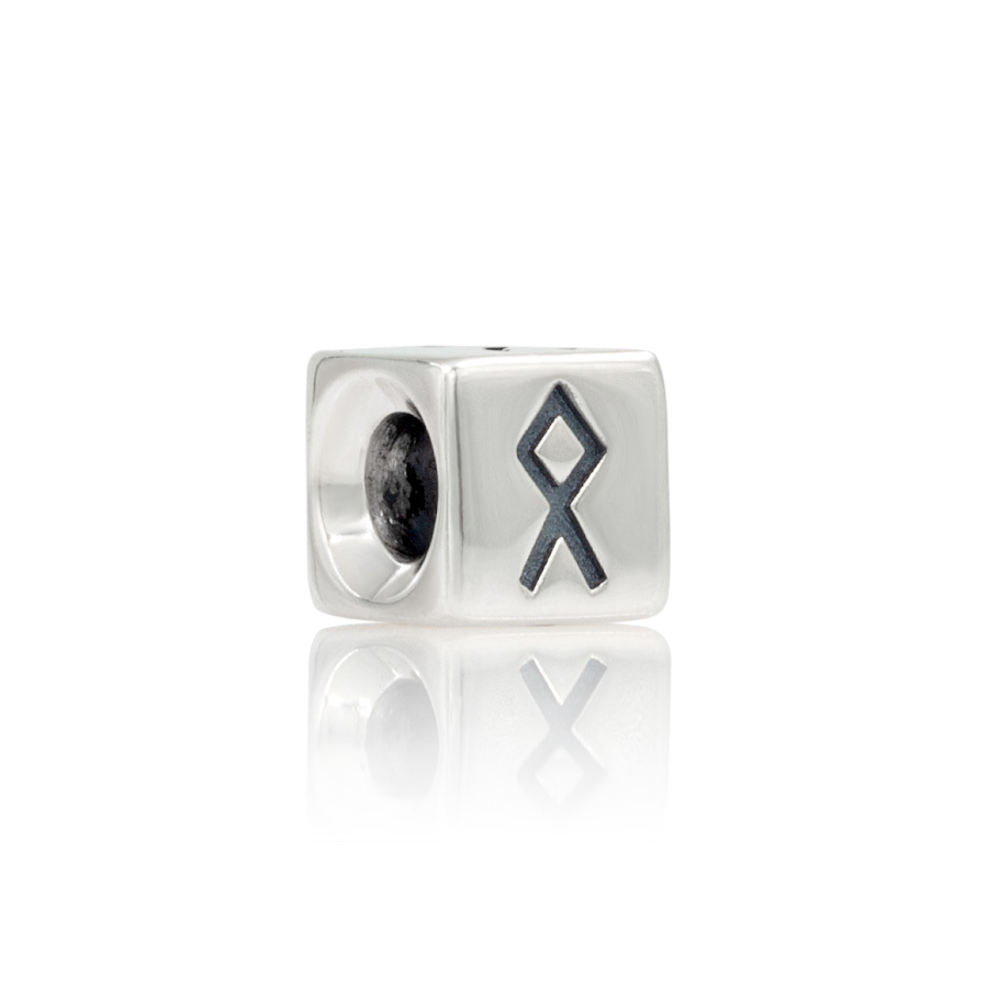 Шарм изготовлен из серебра 925 пробы с руной Одал, символизировавшей у древних скандинавов родовые ценности и землю предков. Замкнутый контур с выступающими линиями на грани куба выглядит чётко и симметрично.