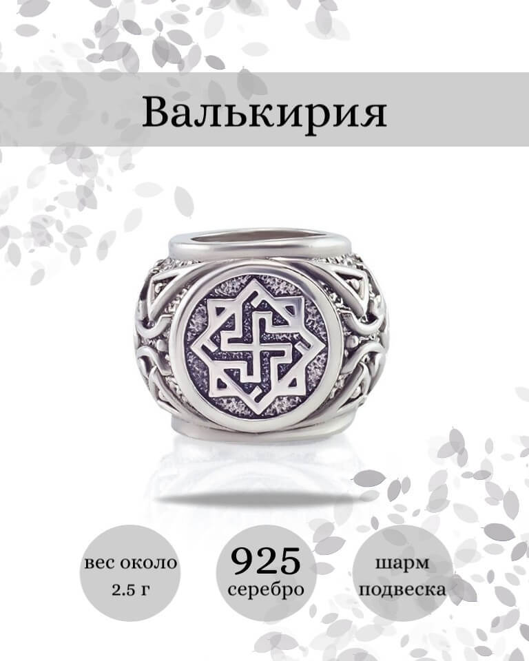На шарме Валькирия проставлены два типа клейма: клеймо производителя и клеймо пробирной инспекции. В случаях если изделие имеет вес менее 3х грамм, согласно закона, на нём может отсутствовать клеймо пробирной инспекции, не удивляйтесь, это нормально и допустимо.