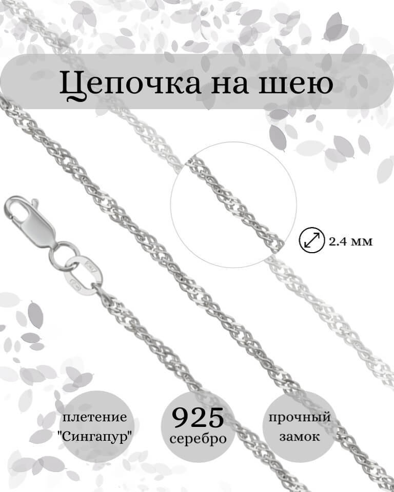 Мы гарантируем быструю доставку и высокий уровень сервиса. Выбирая женскую цепочку на шею из серебра с плетением сингапур на нашем сайте, вы можете быть уверены в том, что получите уникальный и стильный аксессуар, который подчеркнет вашу индивидуальность и ярко выразит вашу красоту и элегантность. Приобретайте у нас женскую цепочку на шею из серебра с плетением сингапур и наслаждайтесь неповторимым стилем и элегантностью! Наша компания готова предложить вам только лучшее качество товаров и услуг.