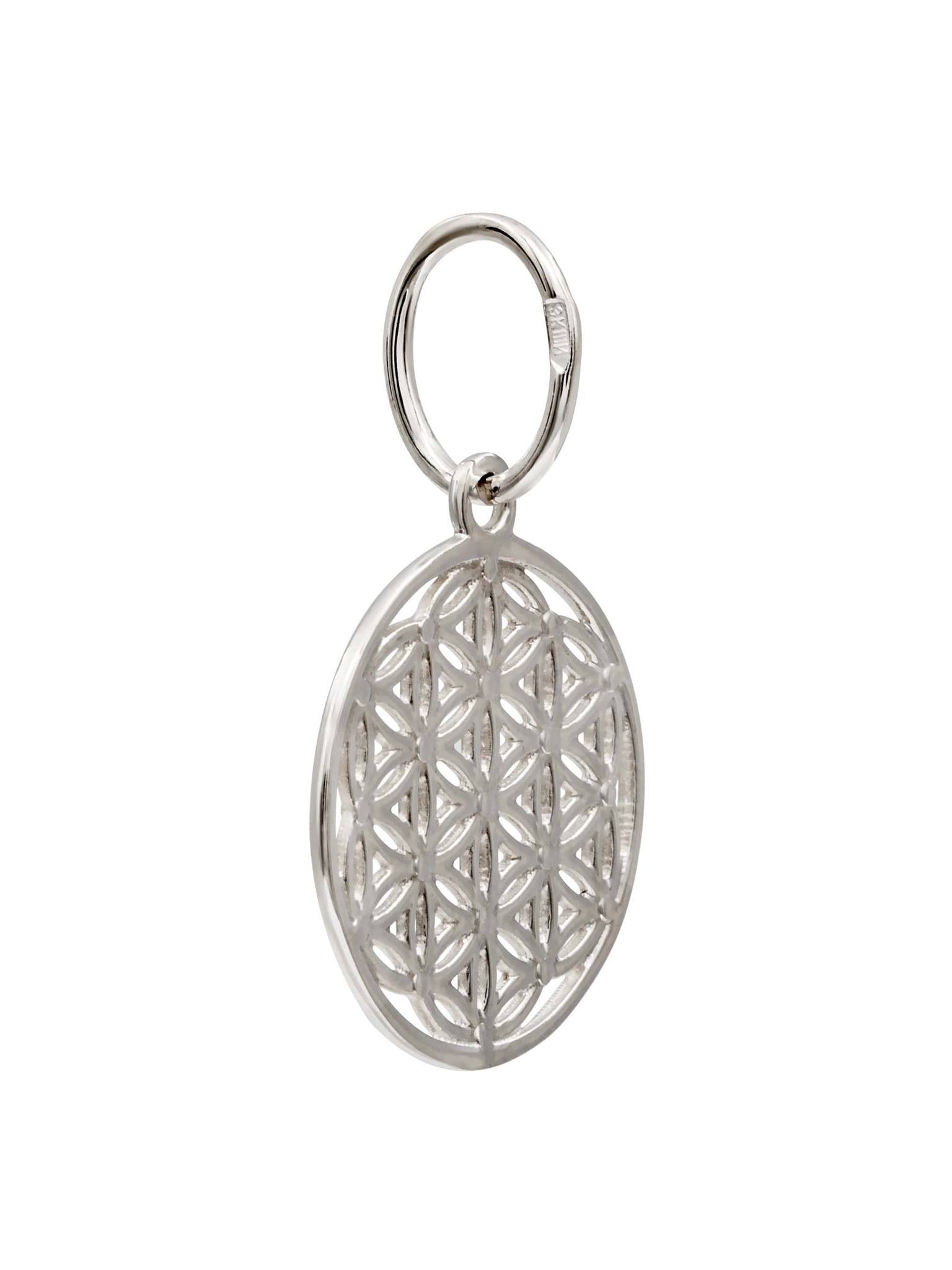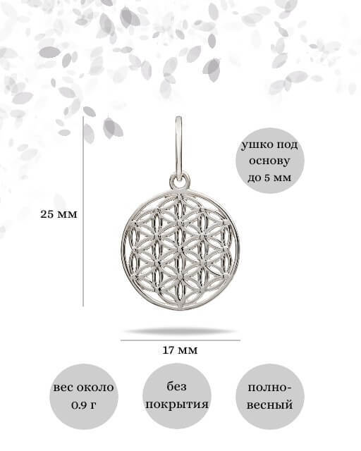 Ювелирная подвеска Цветок жизни изготовлена из серебра 925 пробы. Вес изделия около 0.9 г, размер 36х25 мм, ушко на основу до 5 мм. Модель двухсторонняя, плоская. Несмотря на "воздушность" украшения, подвеска обладает достаточной жесткостью, так как прошла дополнительную термическую обработку (закаливание).