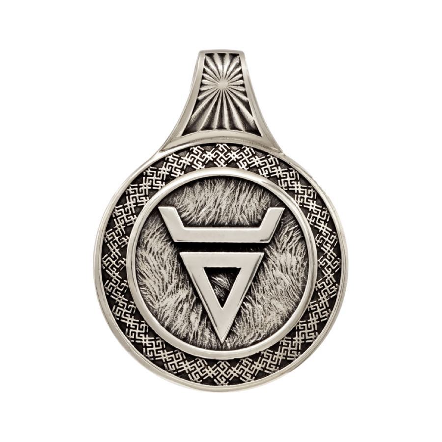 Модель изготовлена из мельхиора. С одной стороны модели изображён стилизованный символ Велеса. На обратной стороне подвески изображена морда медведя.