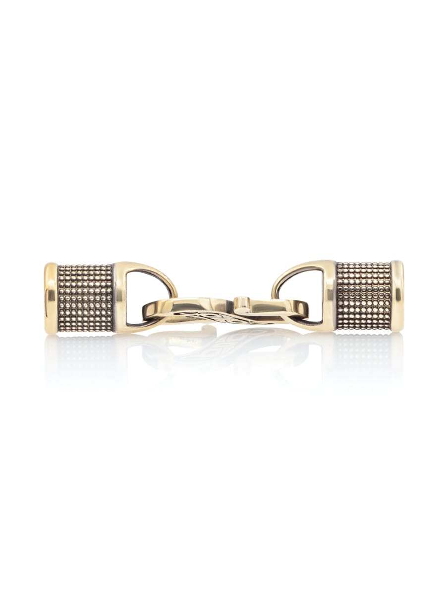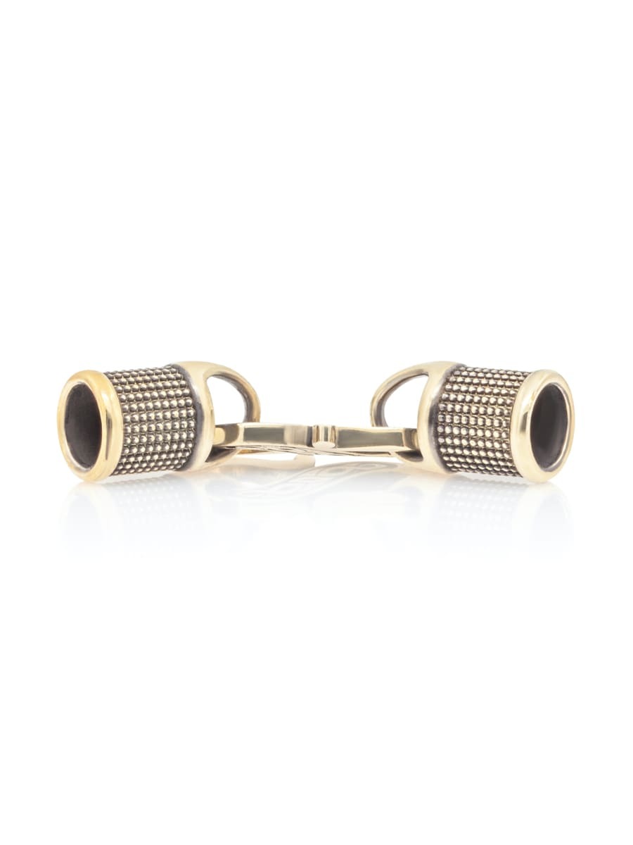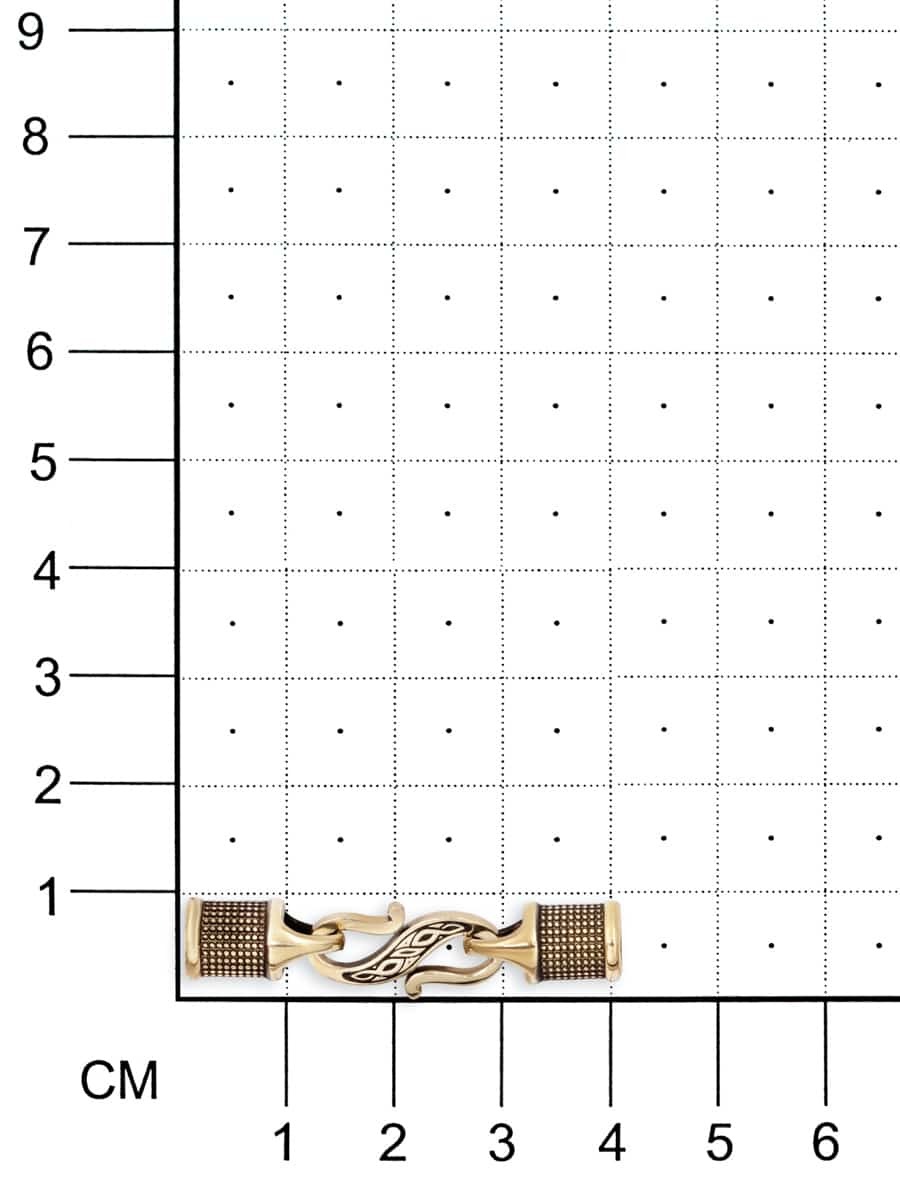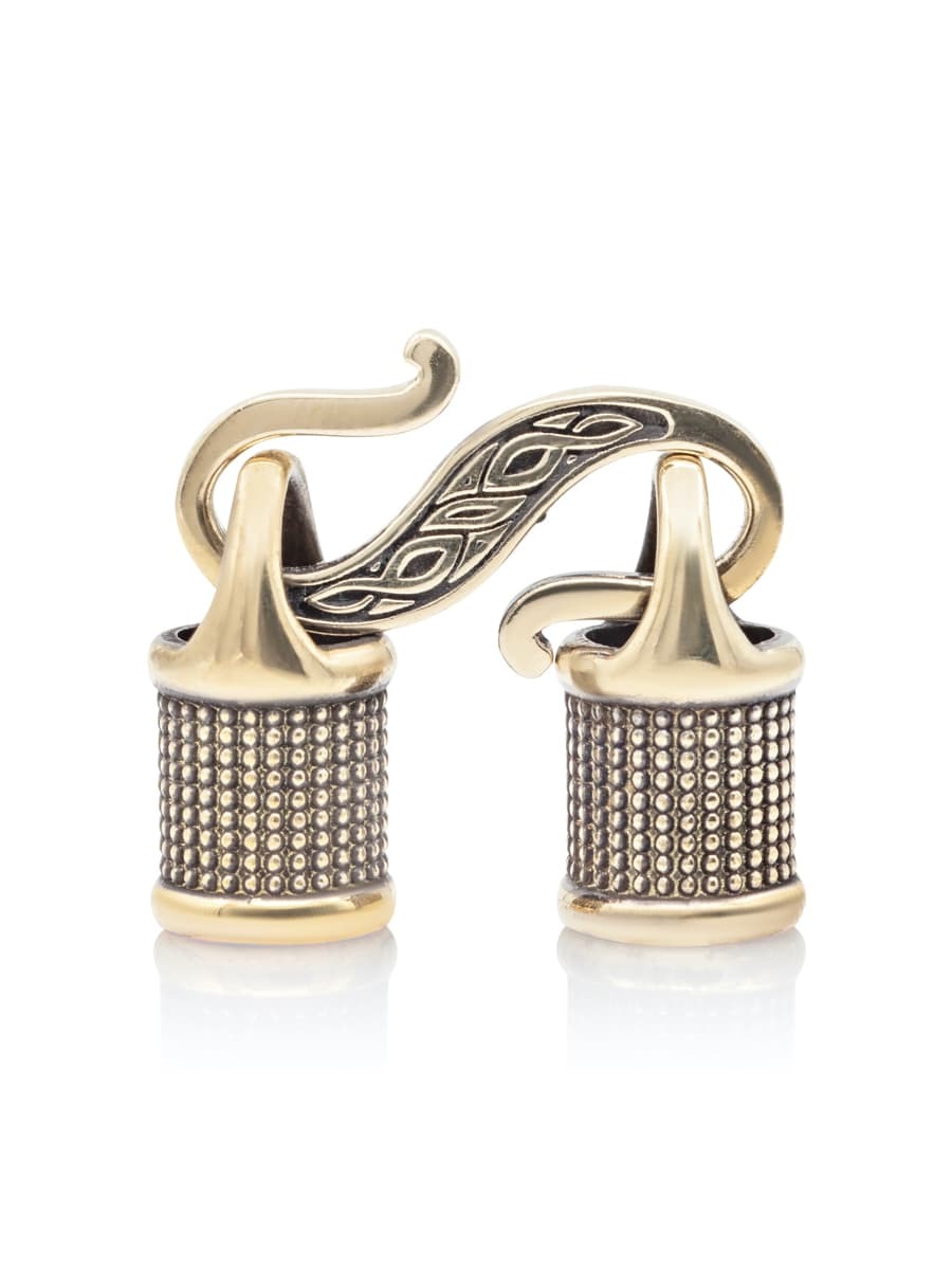 Как видно на изображениях замок для гайтана состоит из двух основных частей. Первый элемент состоит из двух одинаковых концевиков украшенных по окружности узором в виде повторяющихся окружностей. Второй элемент состоит из "S" образного элемента.