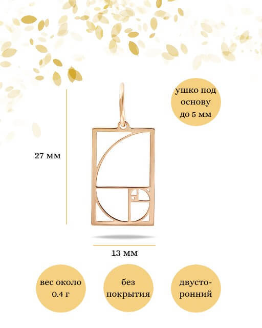 Ювелирная подвеска на шею с изображением золотого сечения Фибоначчи изготовлена из золота 585 пробы и отполирована до зеркального блеска. Размер изделия 27х13 мм, ушко под основу до 5 мм, вес около 0,4 г. Модель двухсторонняя, плоская. Несмотря на "воздушность" украшения, подвеска обладает достаточной жесткостью, так как прошла дополнительную термическую обработку (закаливание).